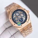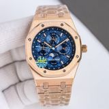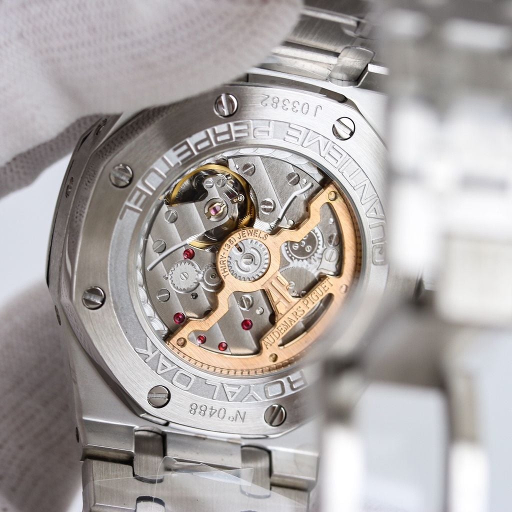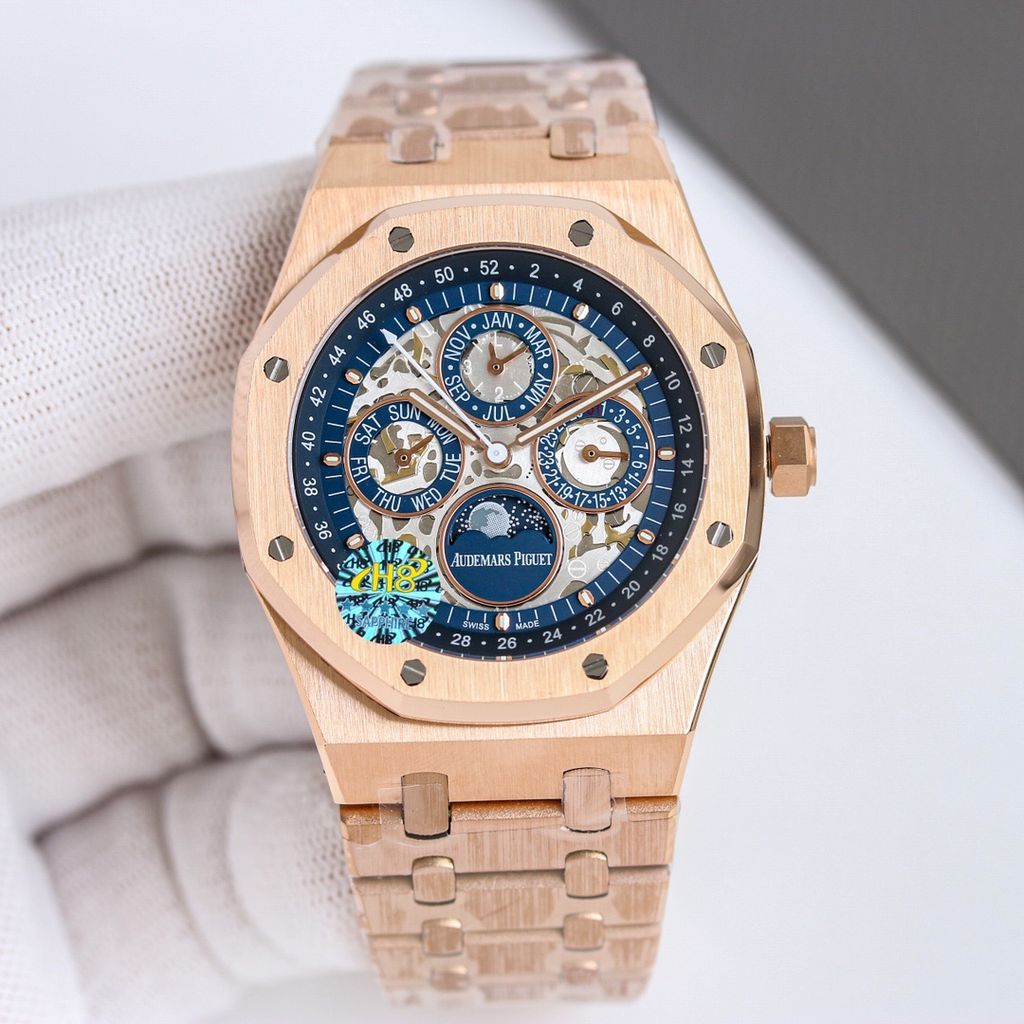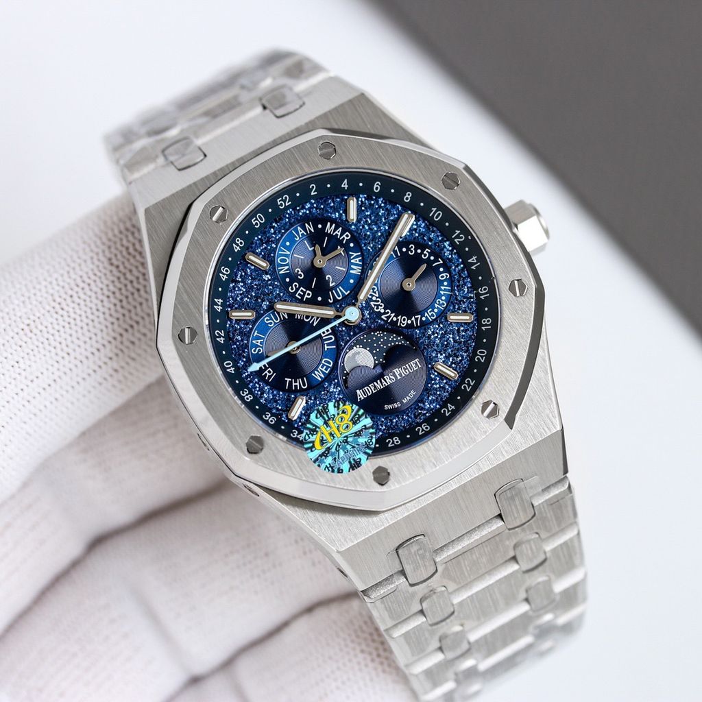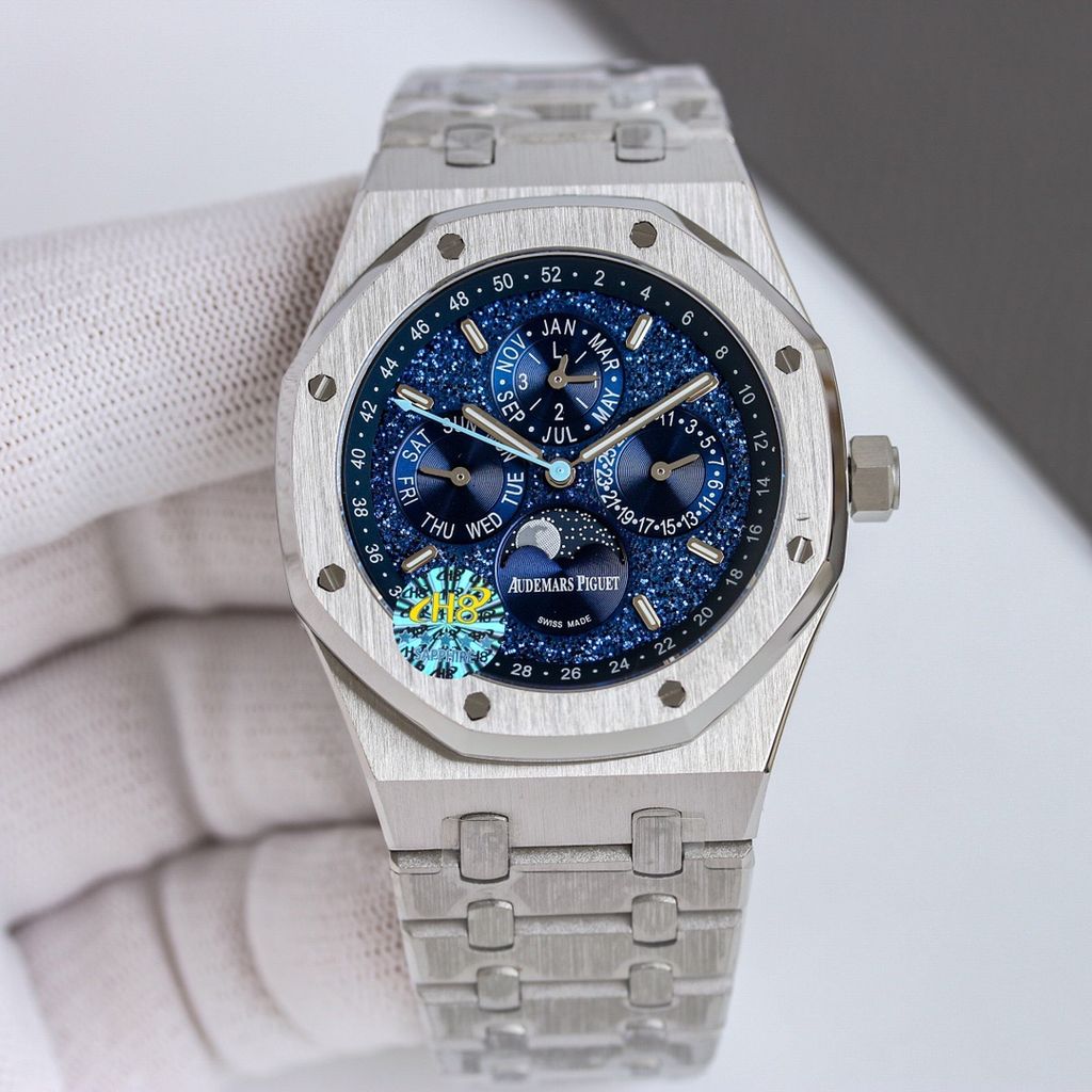 Một phiên bản Royal Oak đúng chất biểu tượng: mặt số đa tầng cuốn hút, lịch trăng sao nổi bật và bộ máy phức tạp để đeo hằng ngày vẫn vận hành trọn vẹn chức năng.