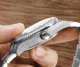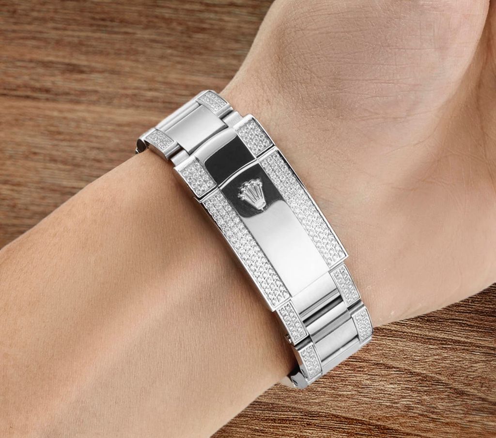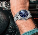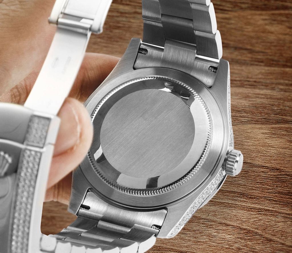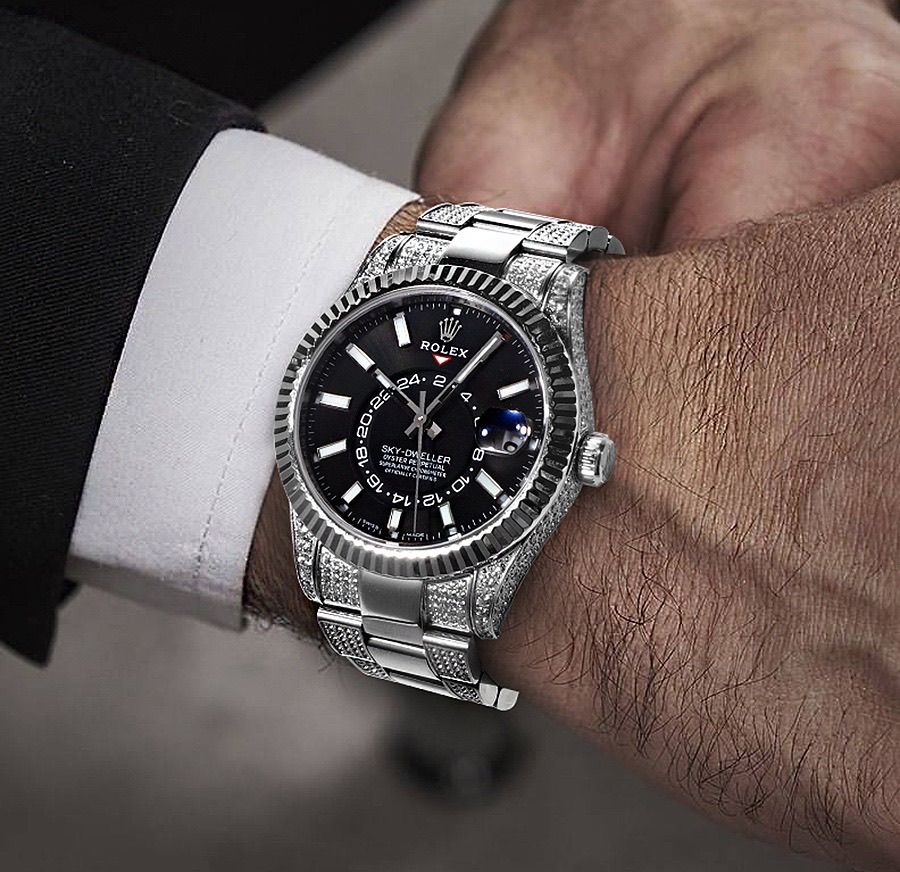 Một phiên bản Sky-Dweller nâng cấp theo tinh thần “đeo lên là thấy khác ngay”: dáng vỏ dày dặn, vành khía mạnh mẽ, mặt số sunburst lên tay bắt sáng có chiều sâu — đặc biệt bộ nạm kim chạy dọc vỏ/lug tạo hiệu ứng nổi bật nhưng vẫn giữ chất nam tính.