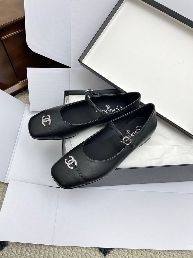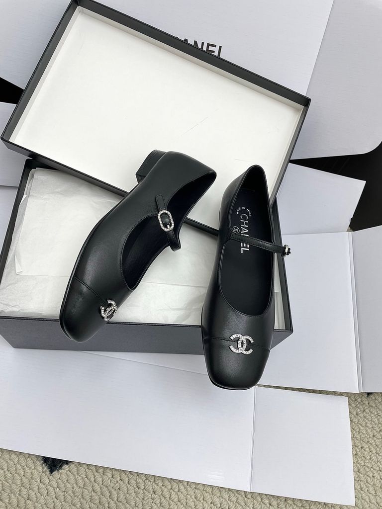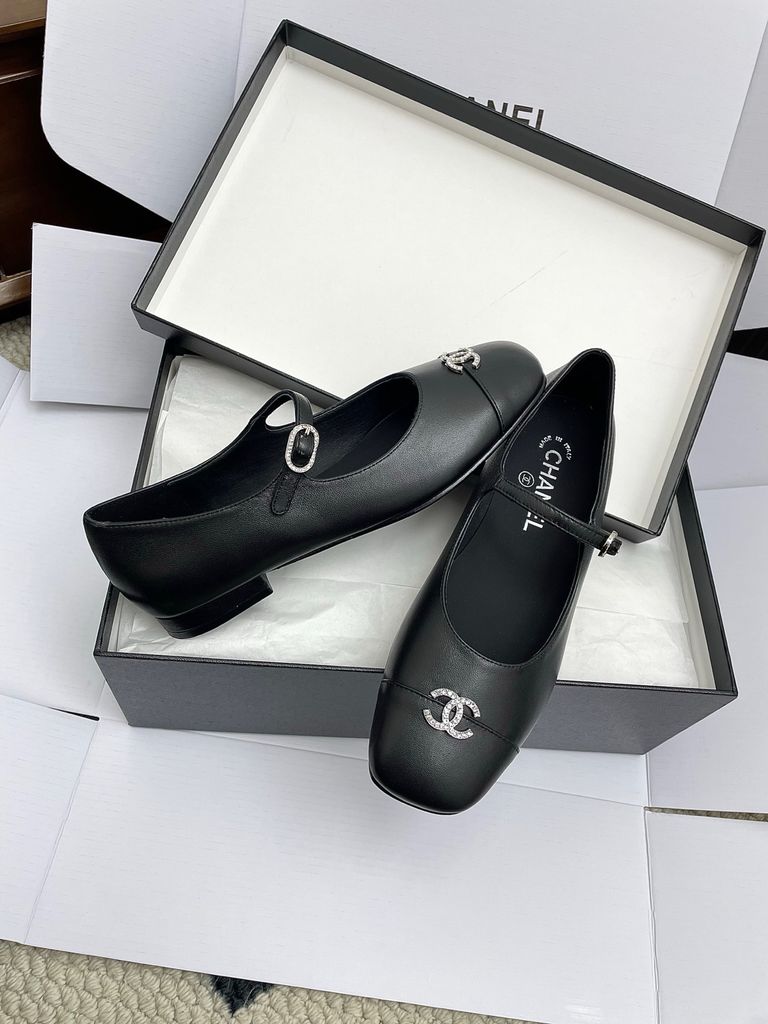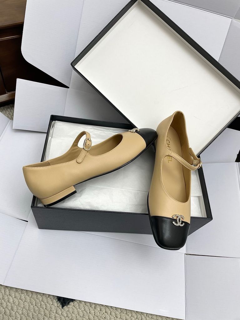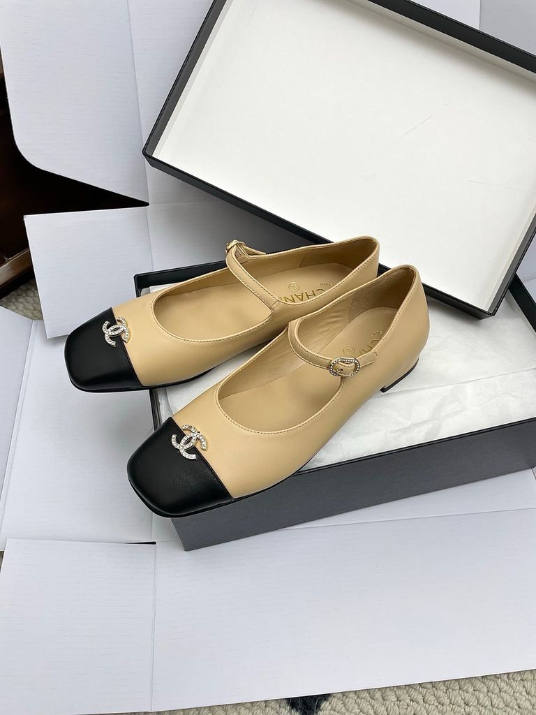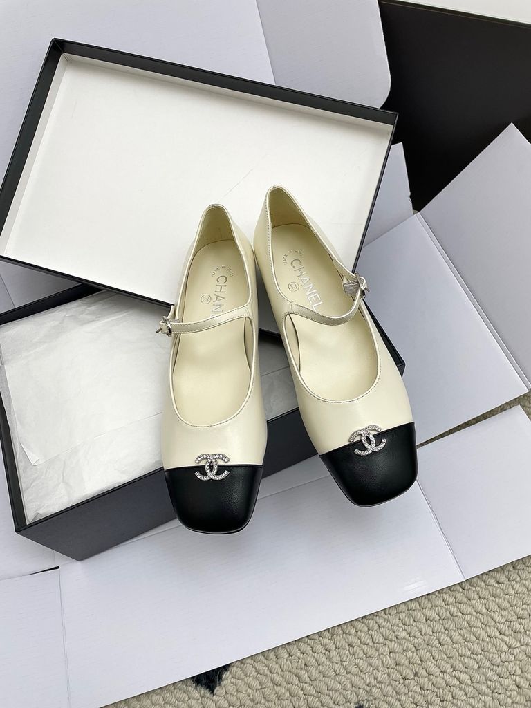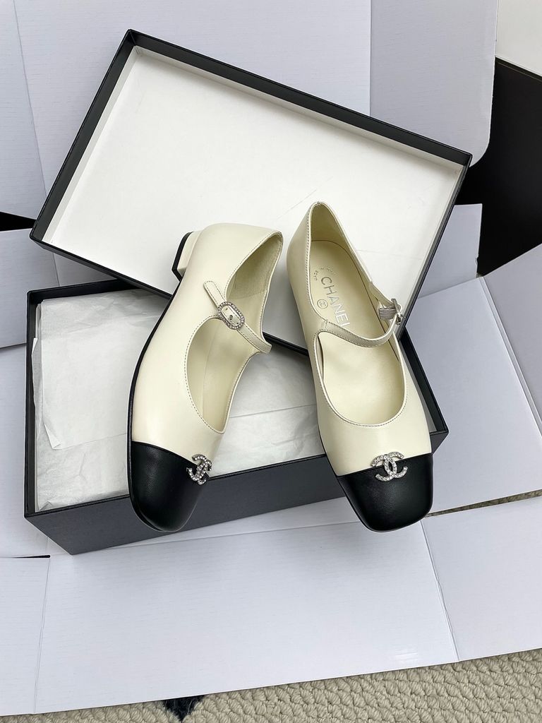 GIÀY NỮ MARY JANE CHA* 2-TONE MŨI ĐEN, KHÓA LOGO ĐÍNH ĐÁ – 1800k (HÀNG ORDER QUỐC TẾ)