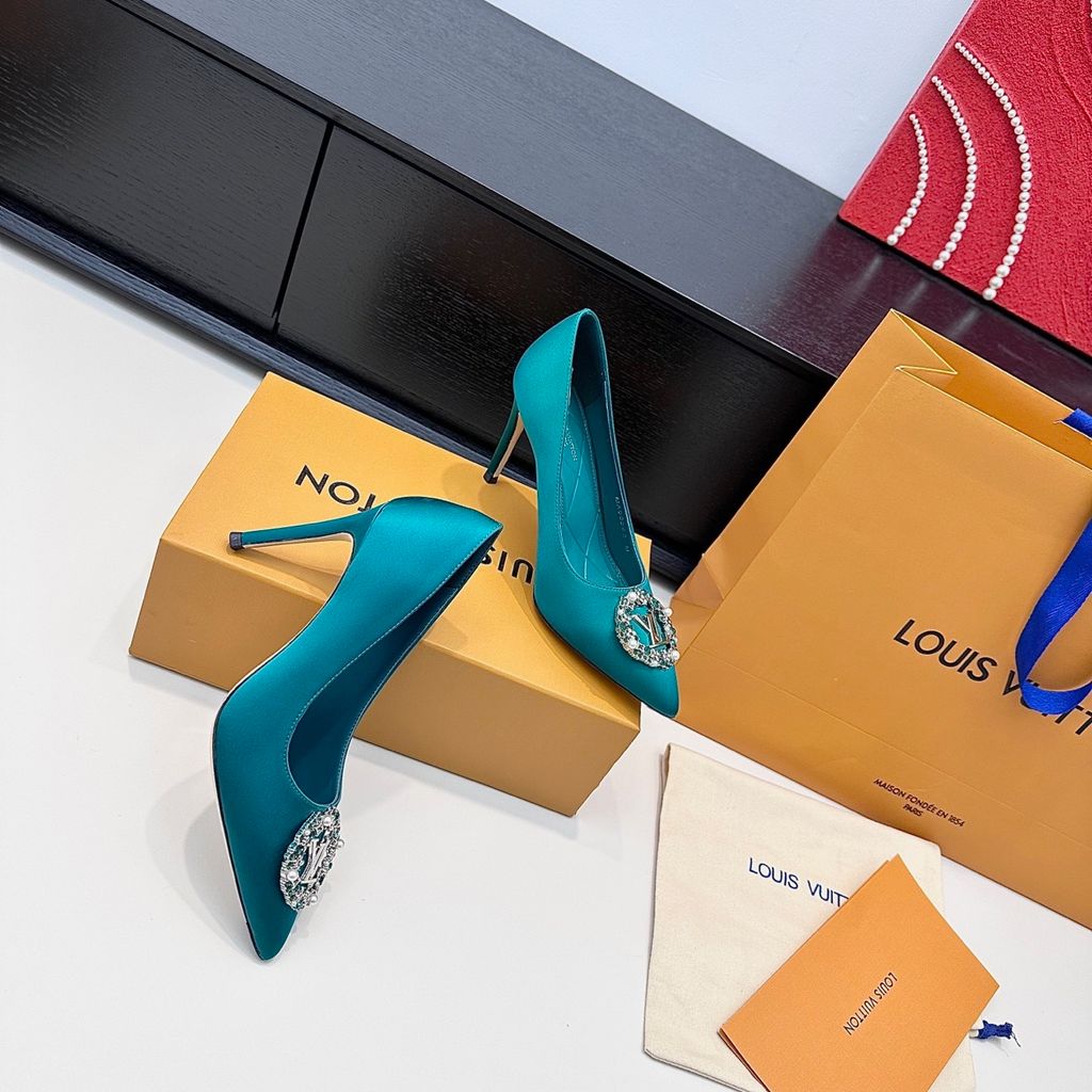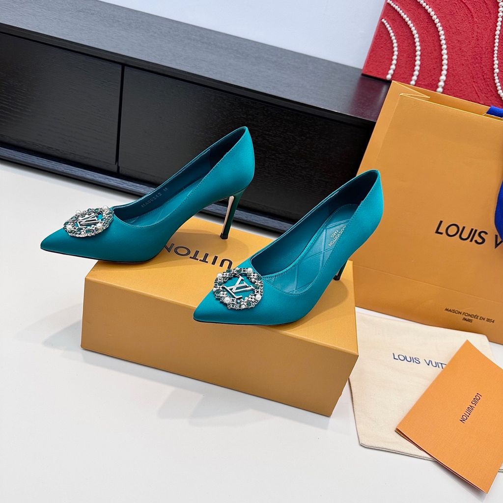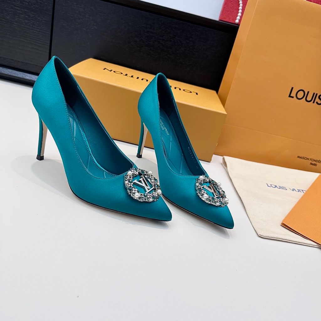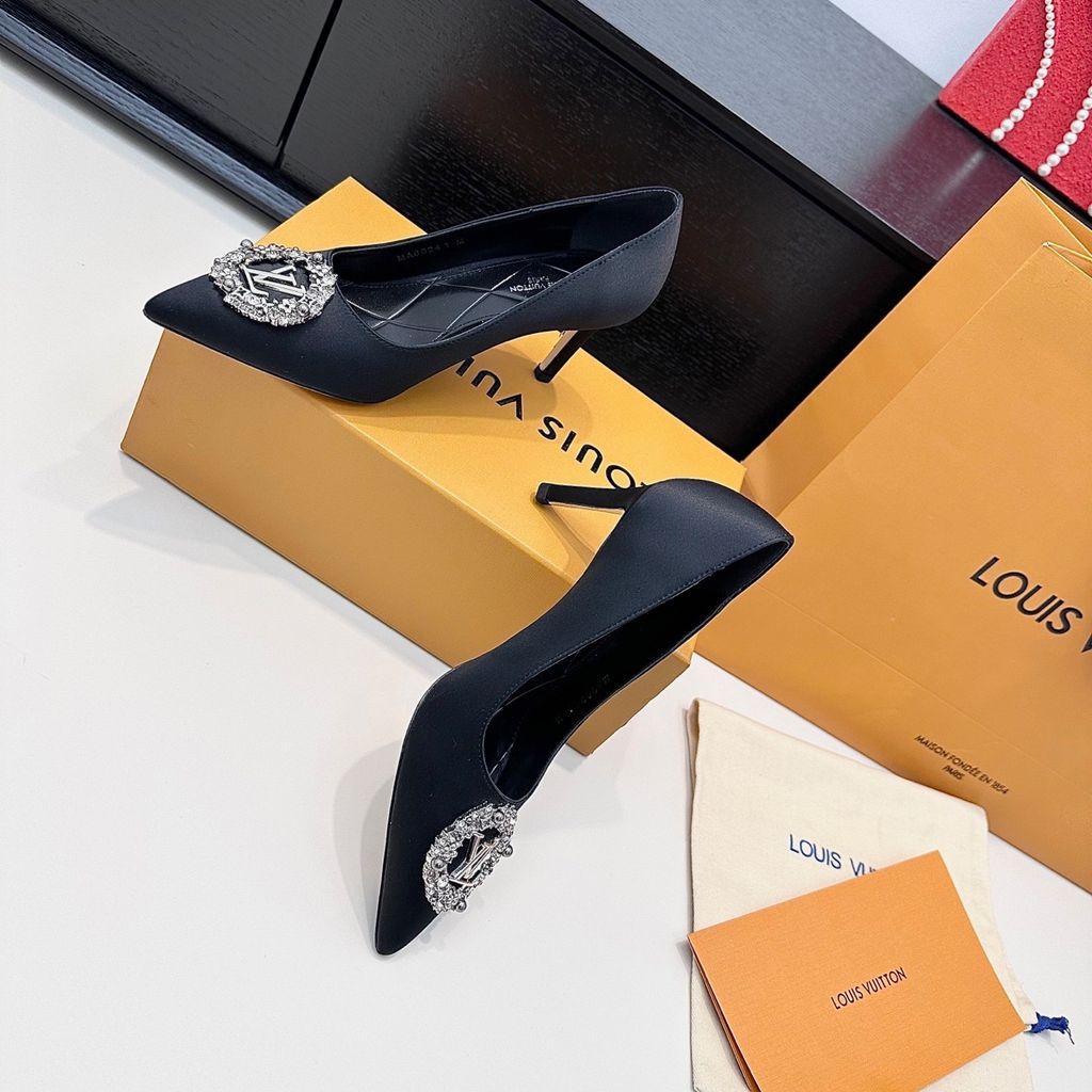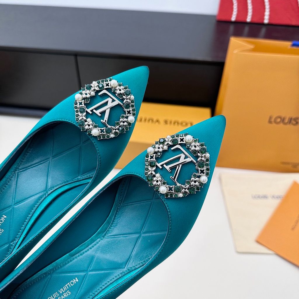 GIÀY CAO GÓT NỮ L V KHÓA LOGO ĐÍNH ĐÁ & NGỌC TRAI LẤP LÁNH SANG CHẢNH – PHOM MŨI NHỌN THANH THOÁT, SATIN/LỤA BÓNG BẮT SÁNG, TÔN DÁNG CHÂN THON GỌN 1750k (HÀNG ORDER QUỐC TẾ)
