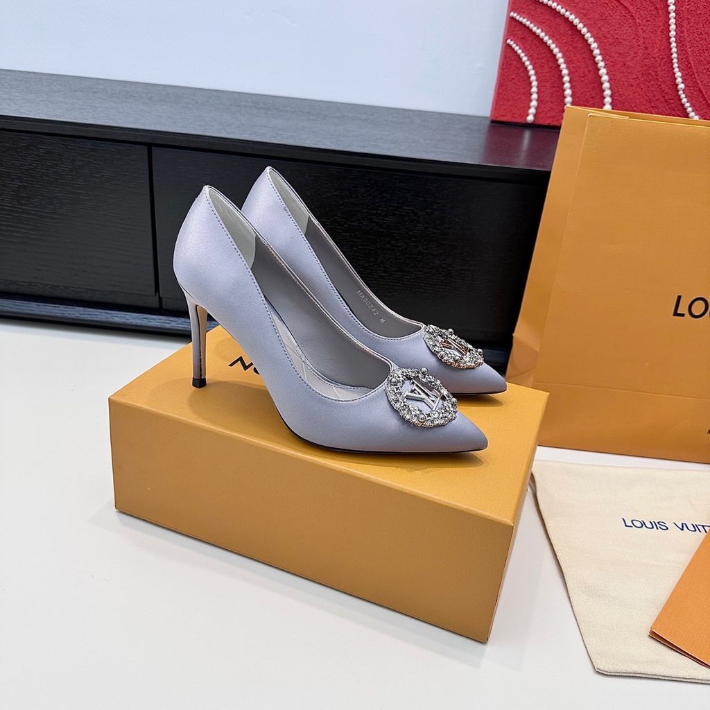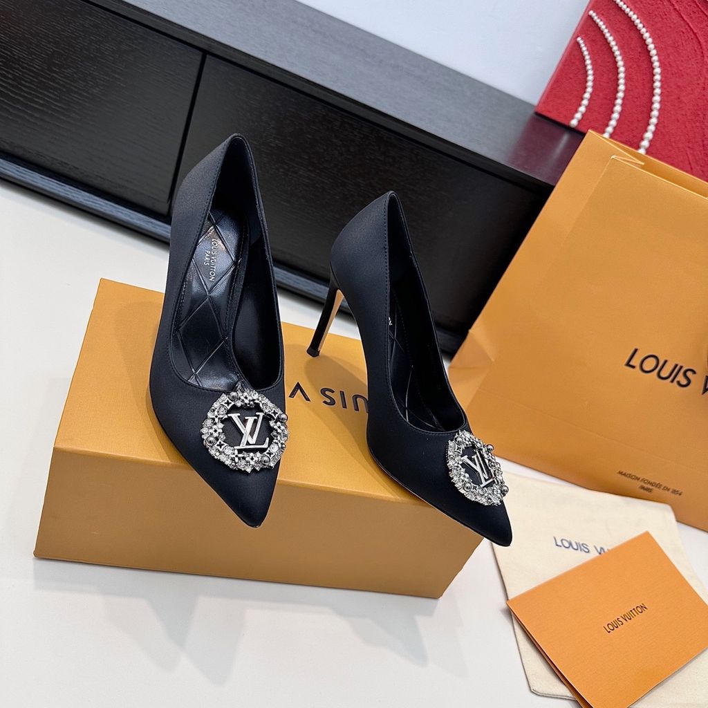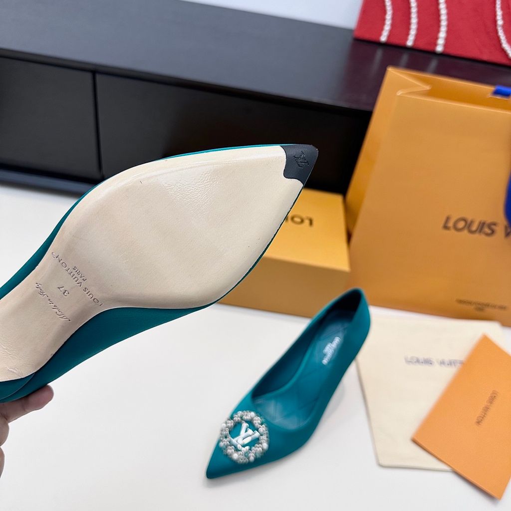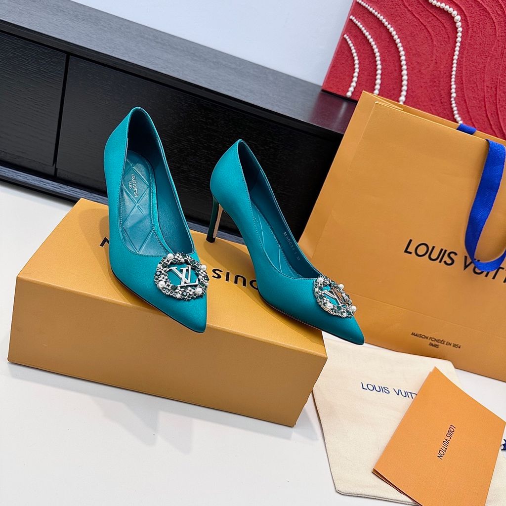 GIÀY CAO GÓT NỮ L V KHÓA LOGO ĐÍNH ĐÁ & NGỌC TRAI LẤP LÁNH SANG CHẢNH – PHOM MŨI NHỌN THANH THOÁT, SATIN/LỤA BÓNG BẮT SÁNG, TÔN DÁNG CHÂN THON GỌN 1750k (HÀNG ORDER QUỐC TẾ)