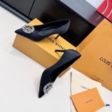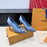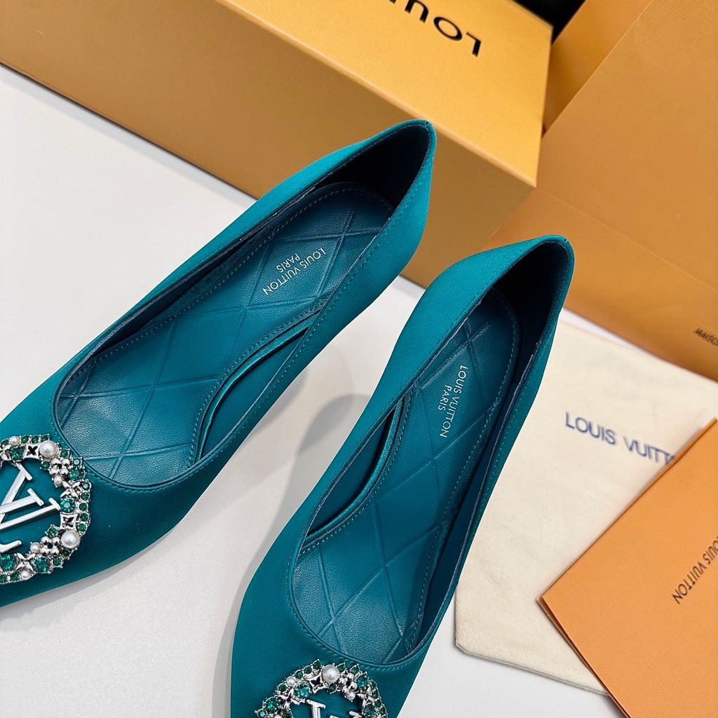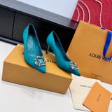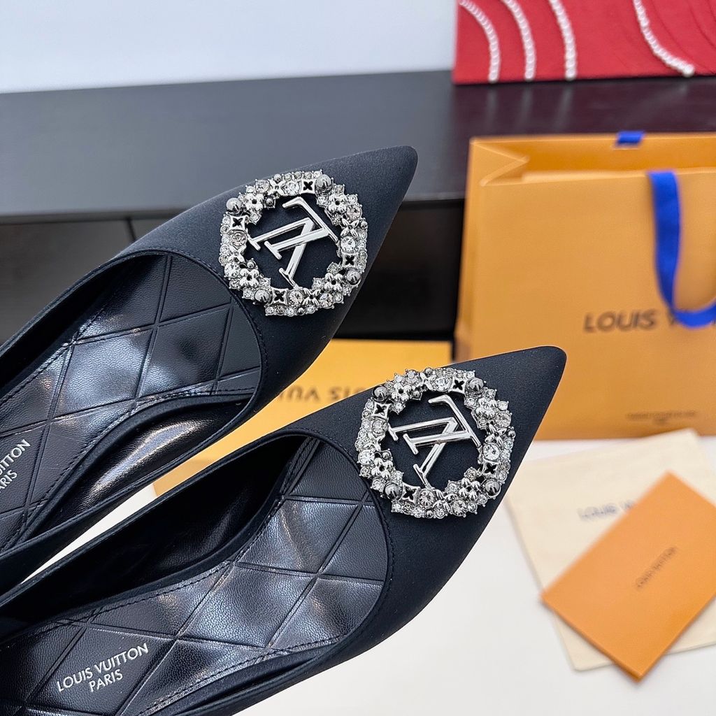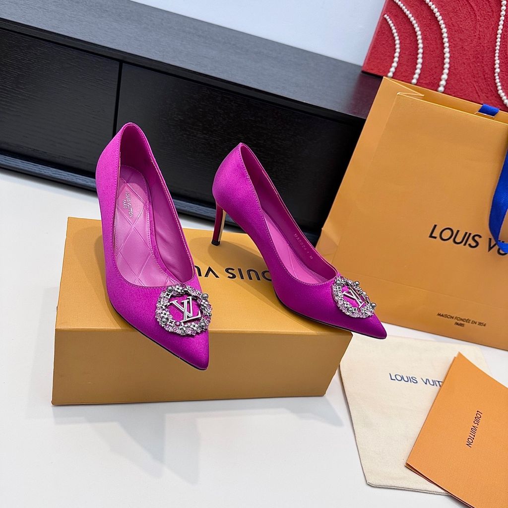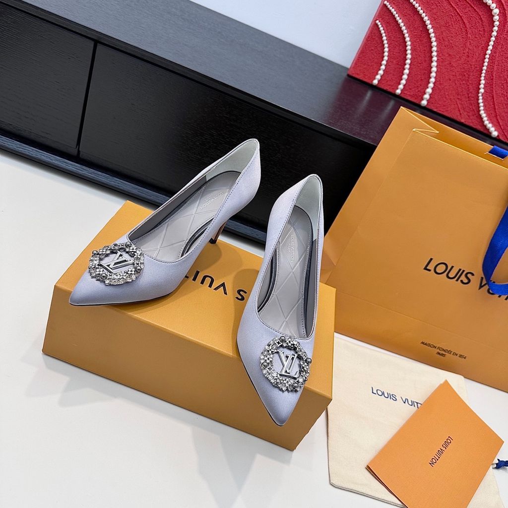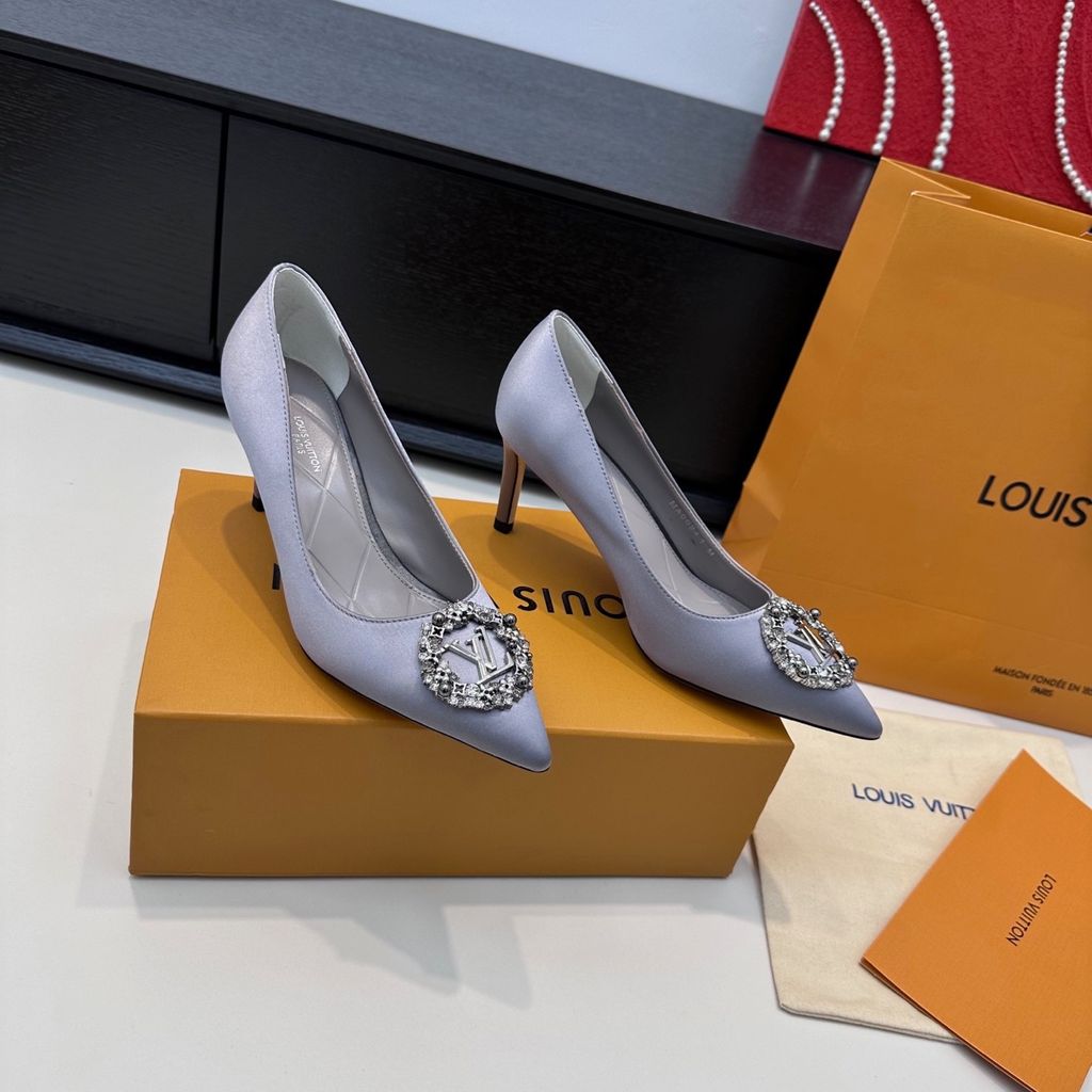 GIÀY CAO GÓT NỮ L V KHÓA LOGO ĐÍNH ĐÁ & NGỌC TRAI LẤP LÁNH SANG CHẢNH – PHOM MŨI NHỌN THANH THOÁT, SATIN/LỤA BÓNG BẮT SÁNG, TÔN DÁNG CHÂN THON GỌN 1750k (HÀNG ORDER QUỐC TẾ)