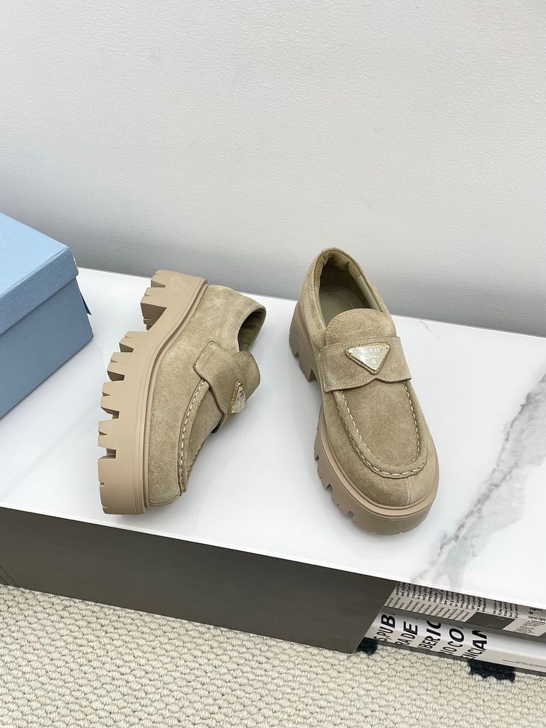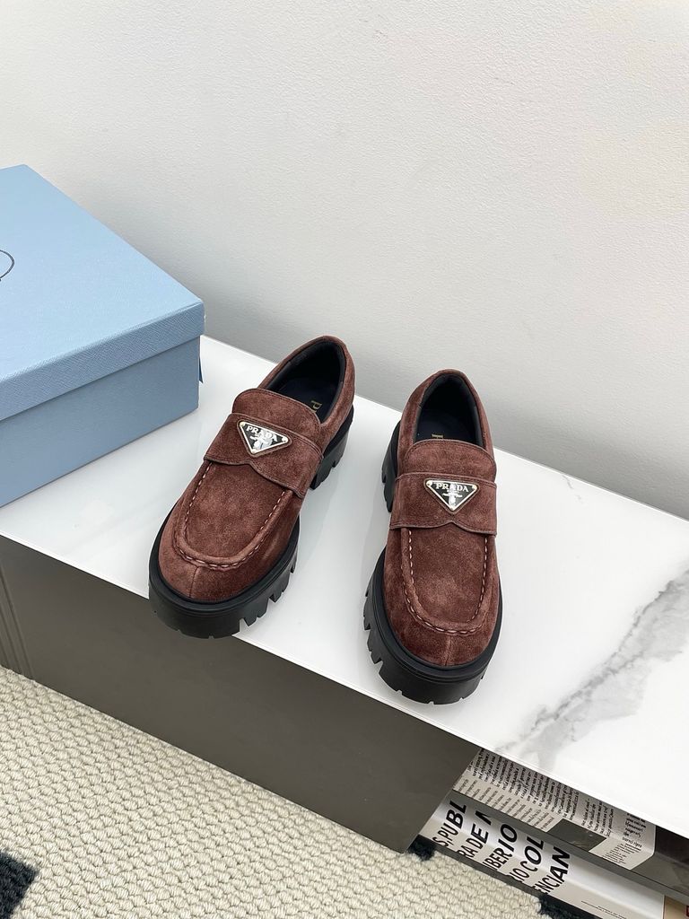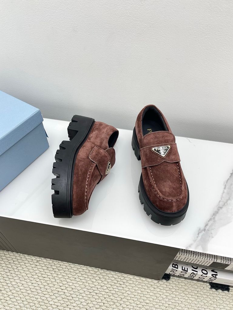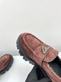 • Gam nâu cacao thời thượng, phom loafer chunky đang “hot” mùa mới; logo tam giác kim loại sáng điểm nhấn, lên chân rất bắt mắt.