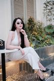 • Chi tiết nhún lệch bất đối xứng kết hợp điểm kim loại tạo hiệu ứng draping mềm nhưng vẫn sắc nét.