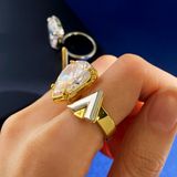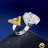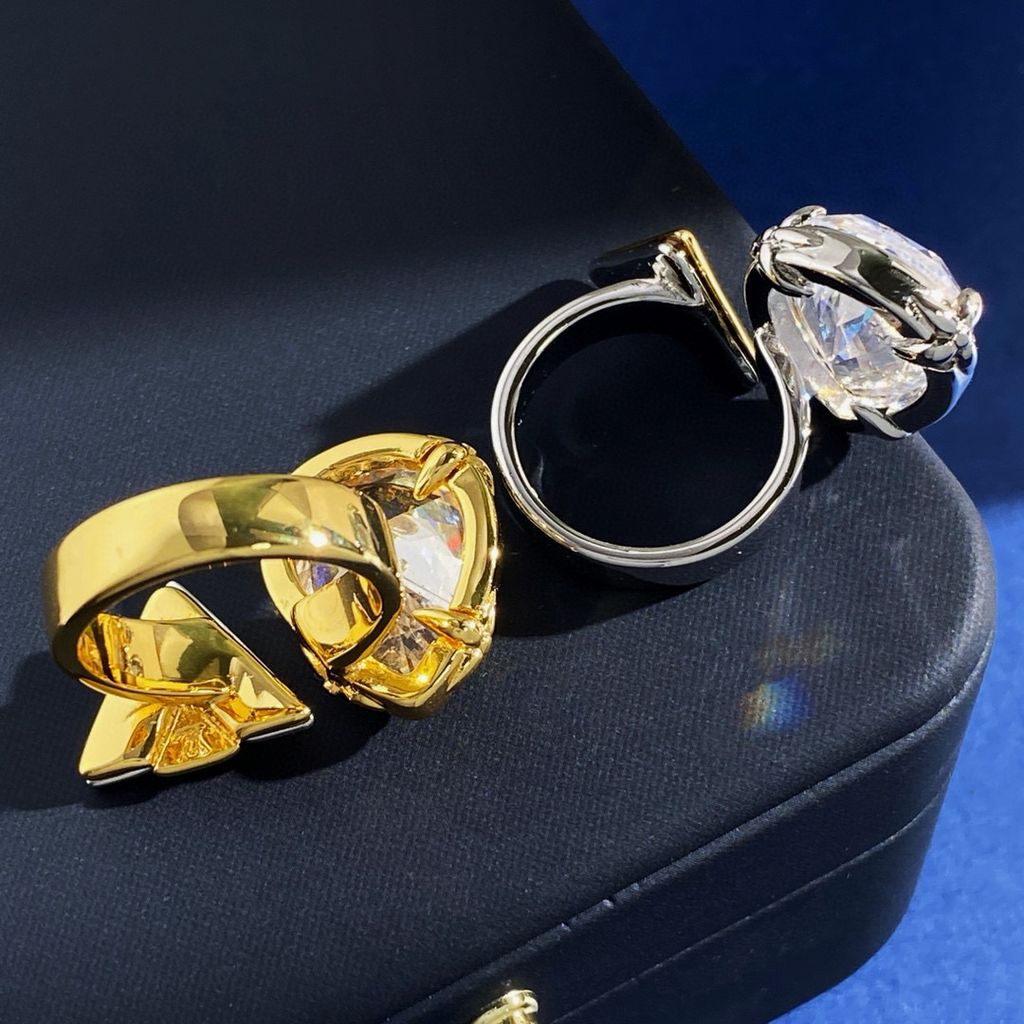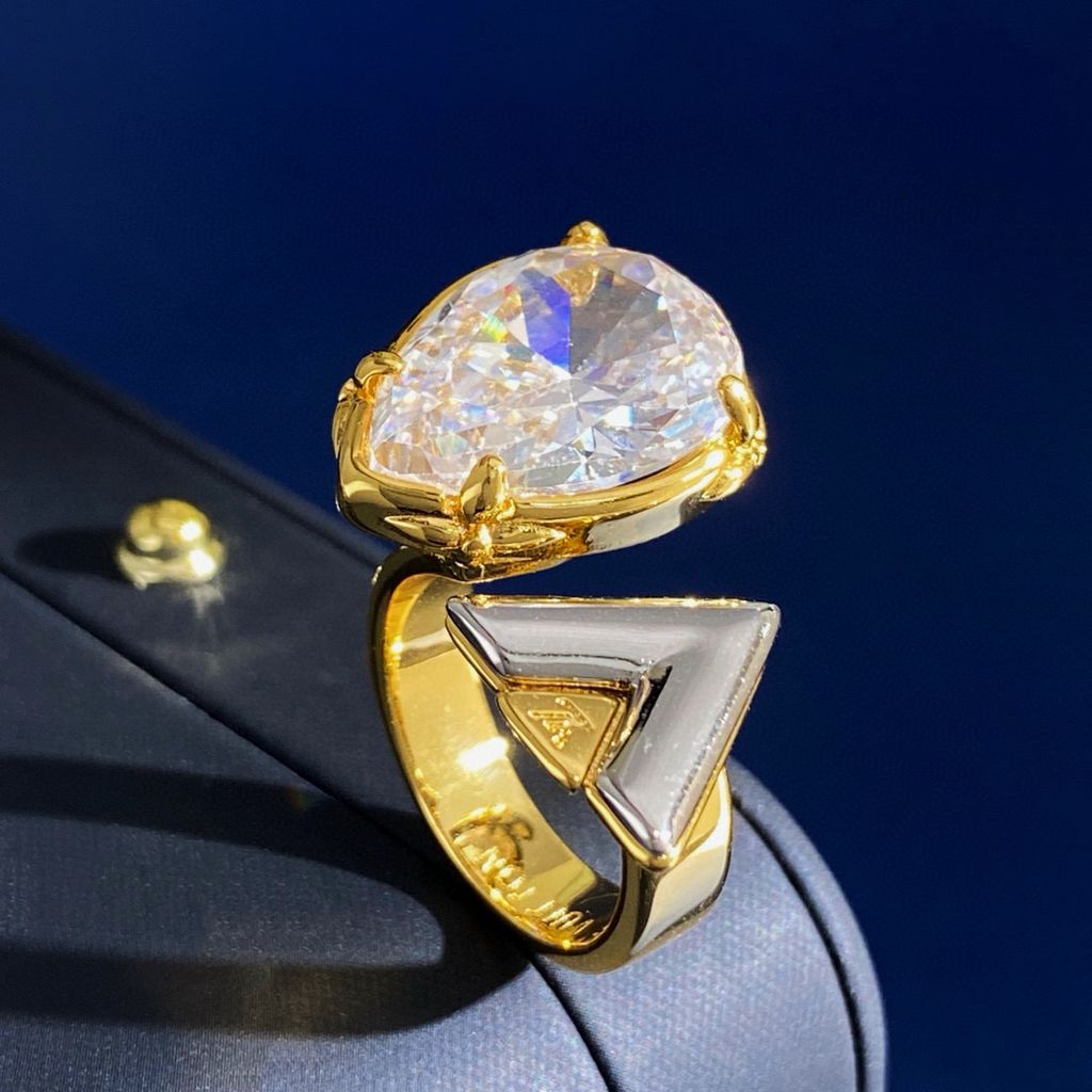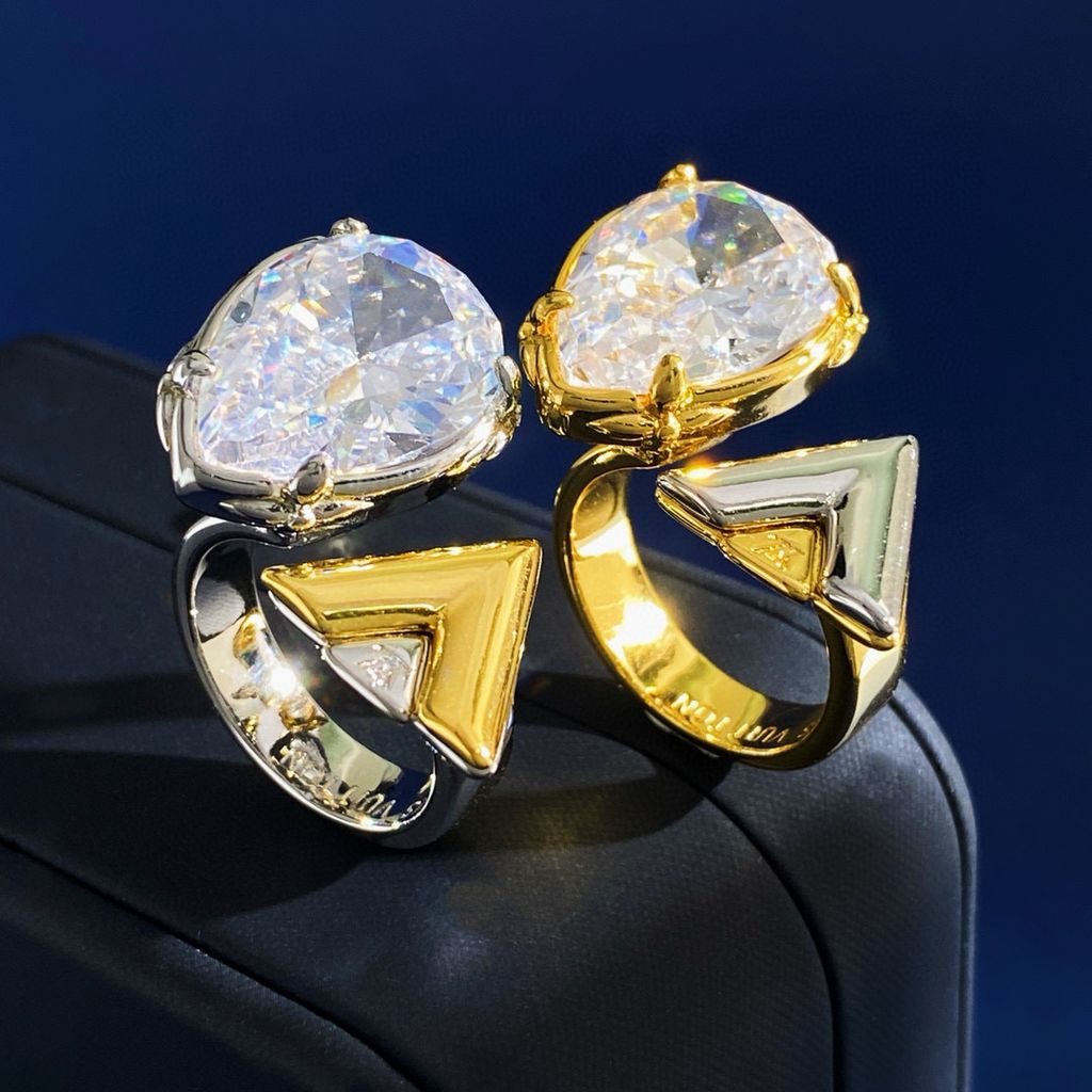 thời trang Châu Âu và Mỹ tinh tế hình giọt nước lớn kim cương đơn đánh bóng chữ V vàng và bạc hai màu nhẫn hở chất liệu đồng thau mạ vàng 2 màu