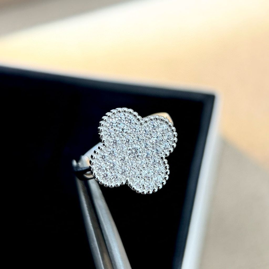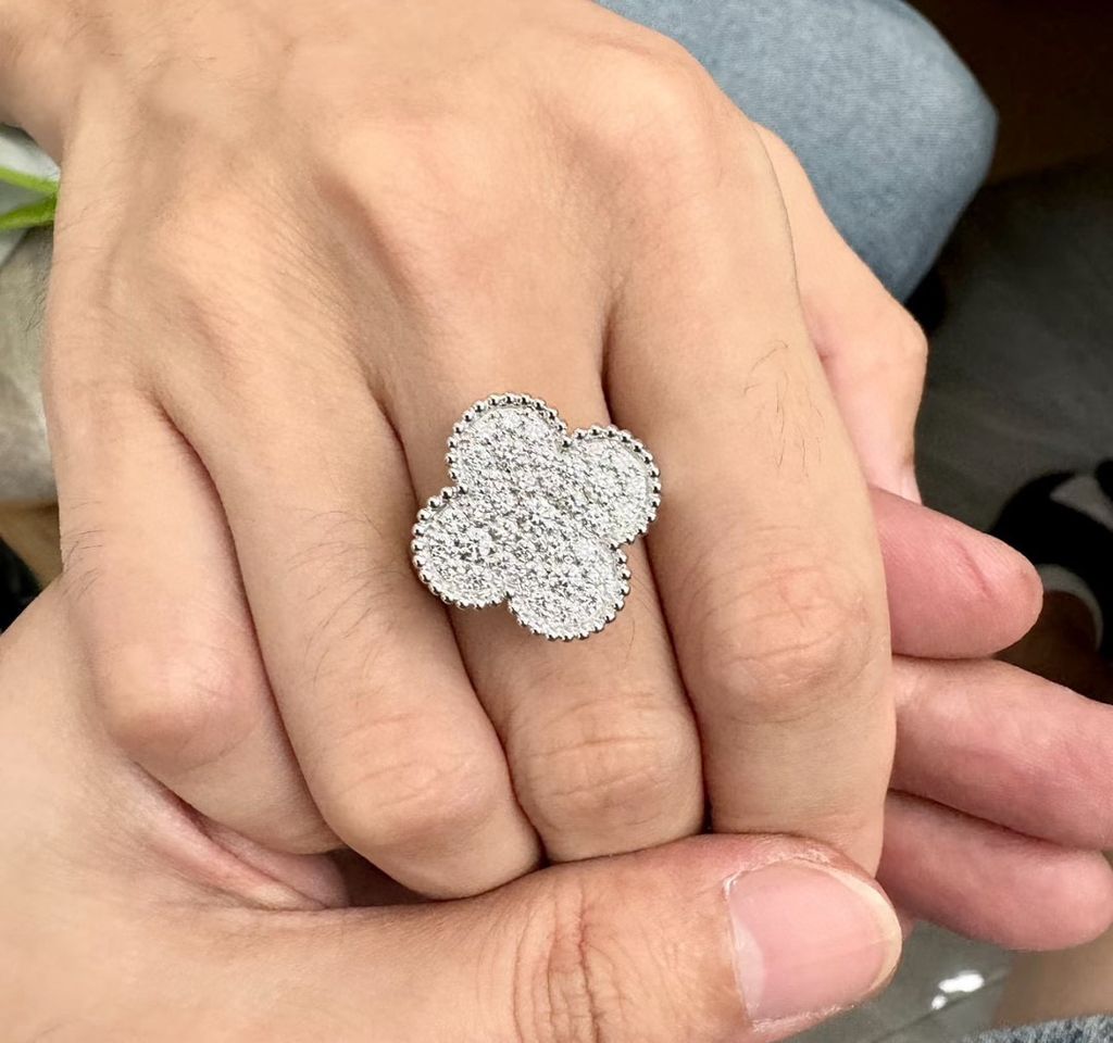 Chiếc nhẫn lớn hình cỏ bốn lá kim cương nguyên khối mới của Fanjia A5044 đủ nặng, đủ chắc và đủ tinh xảo! Toàn bộ thân sản phẩm được làm bằng bạc nguyên chất 925 mạ vàng. Giữ màu vĩnh viễn, các cạnh hạt tròn và đầy đủ, kim cương lớn và nhỏ được sắp xếp so le, mặt sau có cấu trúc hình tổ ong. Điểm nhấn của toàn bộ sản phẩm là chiếc nhẫn bạc nguyên chất mạ vàng dày 678 yard