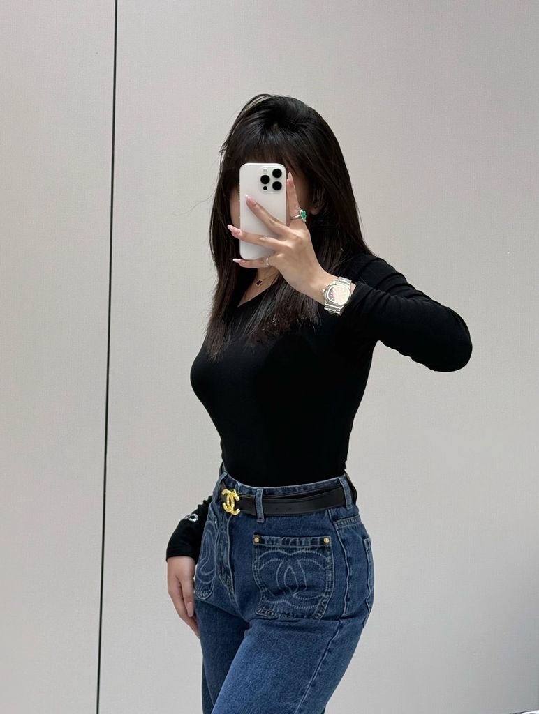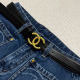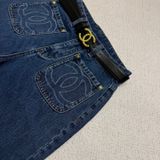 Sắc xanh denim cổ điển kết hợp điểm nhấn kim loại nơi cạp lưng, mang lại diện mạo tinh gọn và nữ tính, dễ phối trong nhiều bối cảnh trang phục.