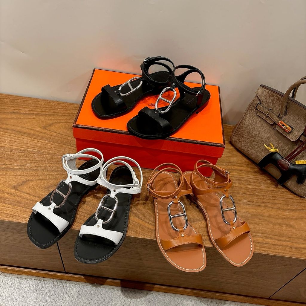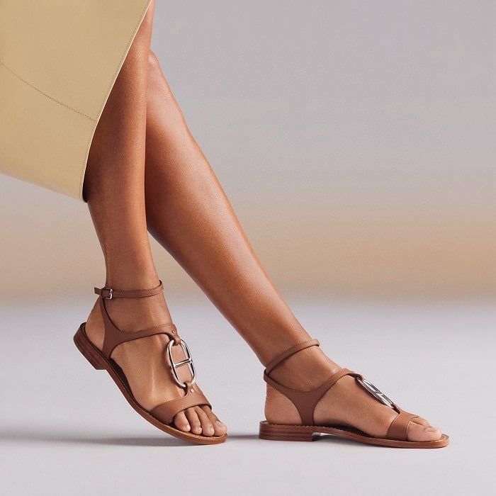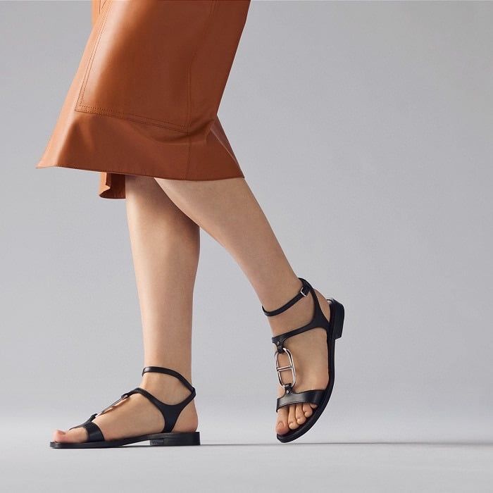 Một phiên bản sandal mới mang vẻ sang trọng, tinh tế: tối giản ở đường nét – nhưng “đắt giá” ở mắt xích kim loại biểu tượng đặt ngay trung tâm, tạo hiệu ứng như một món trang sức trên bàn chân.