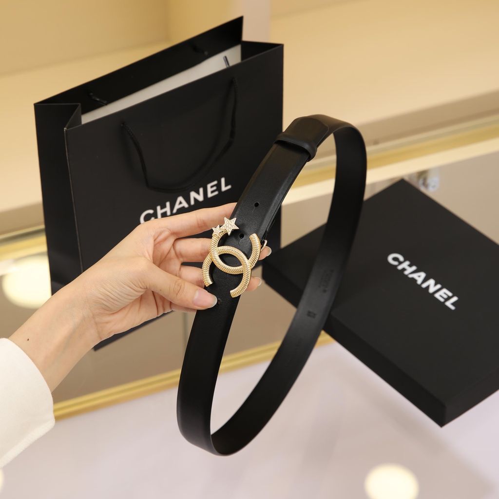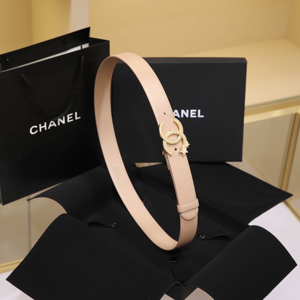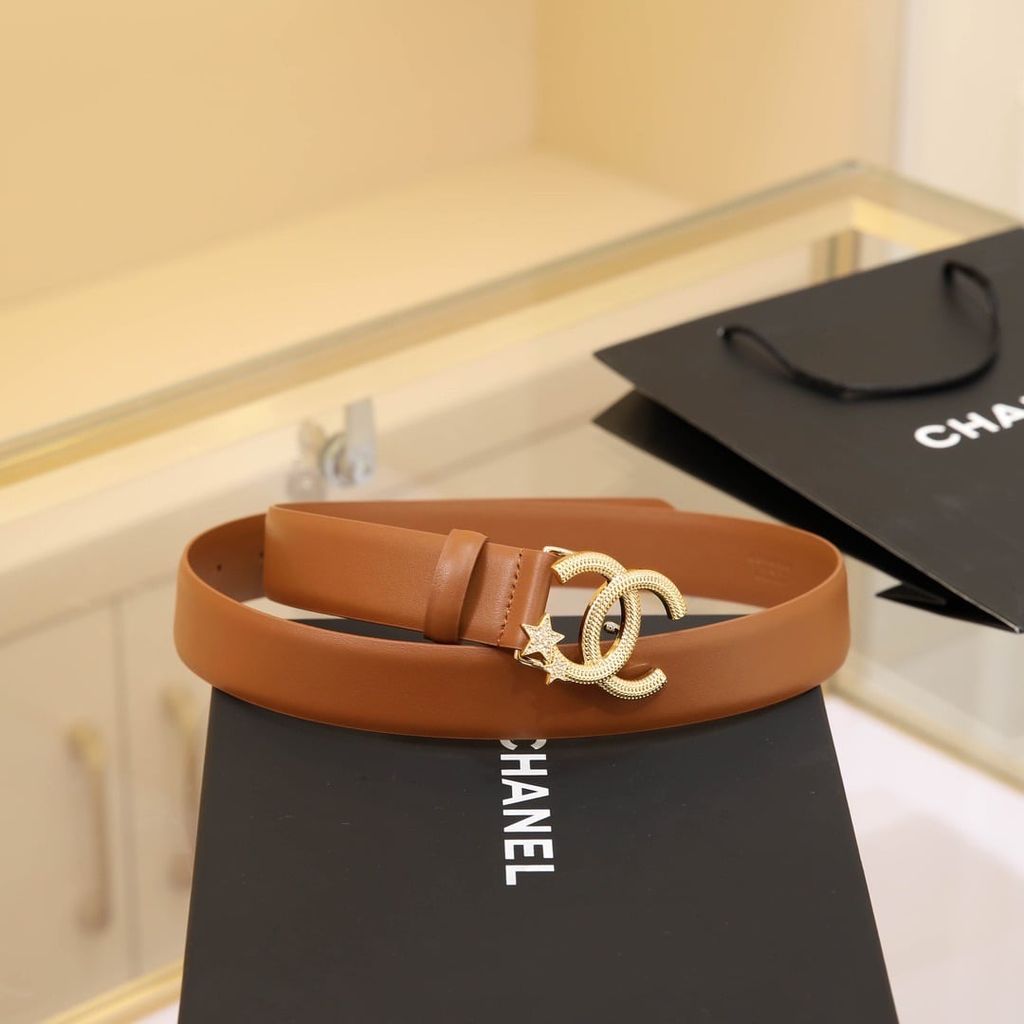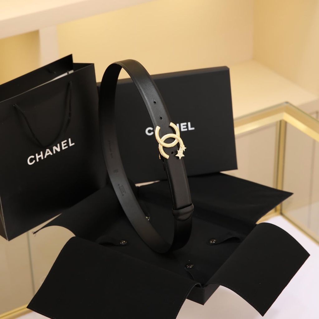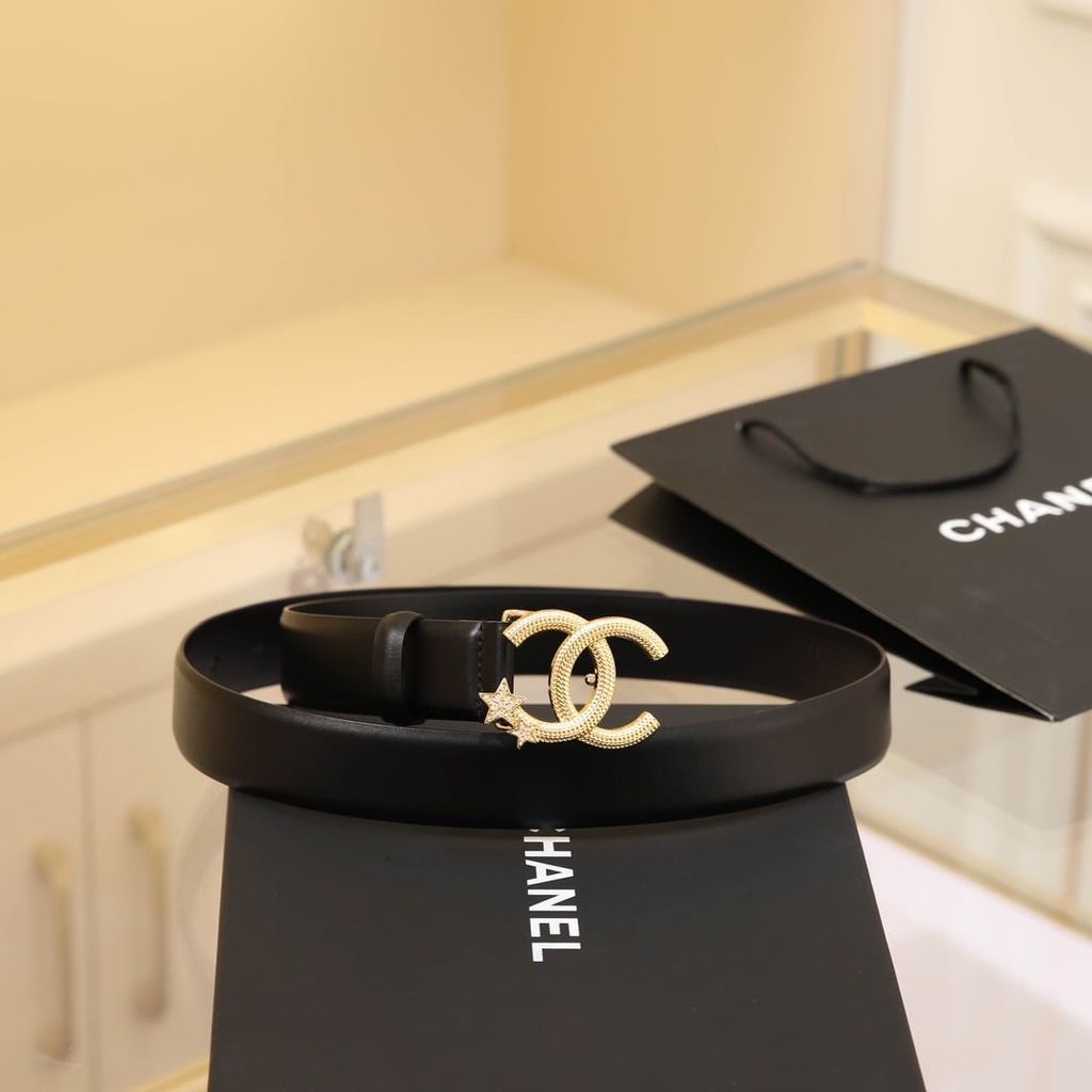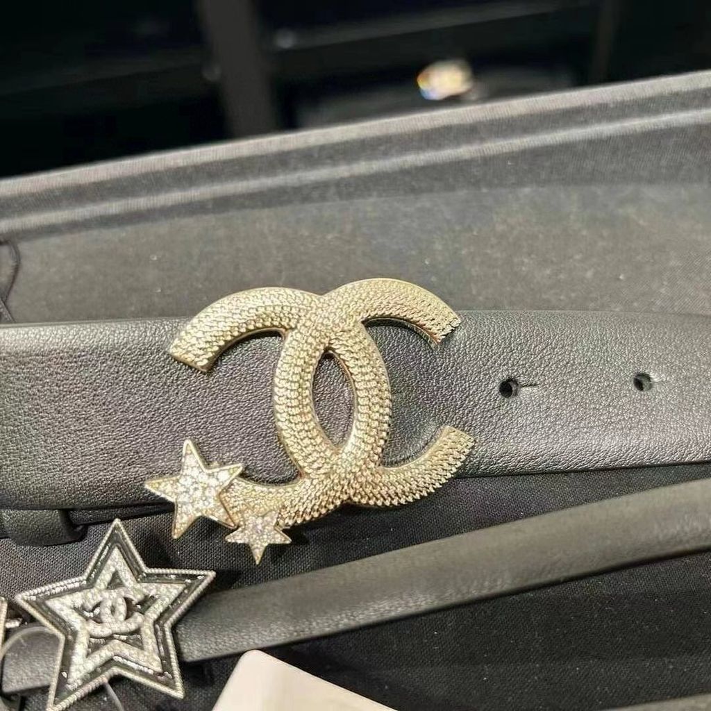 Một mẫu thắt lưng nữ nổi bật ngay từ phần khóa CC đính sao, lên dáng rất cuốn và tạo điểm nhấn tinh tế cho tổng thể trang phục.