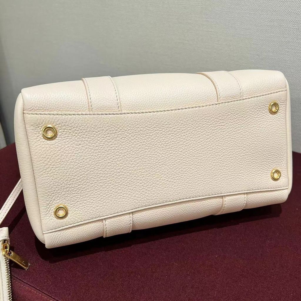 • Thiết kế & dấu ấn: nắp cong mềm mại ôm viền, chi tiết khóa kim loại ánh vàng tạo tâm điểm; tay cầm tròn chắc tay; dáng bo nhẹ hai bên giúp tổng thể cân đối và nữ tính; đáy có đệm giữ phom đẹp khi đặt túi.
