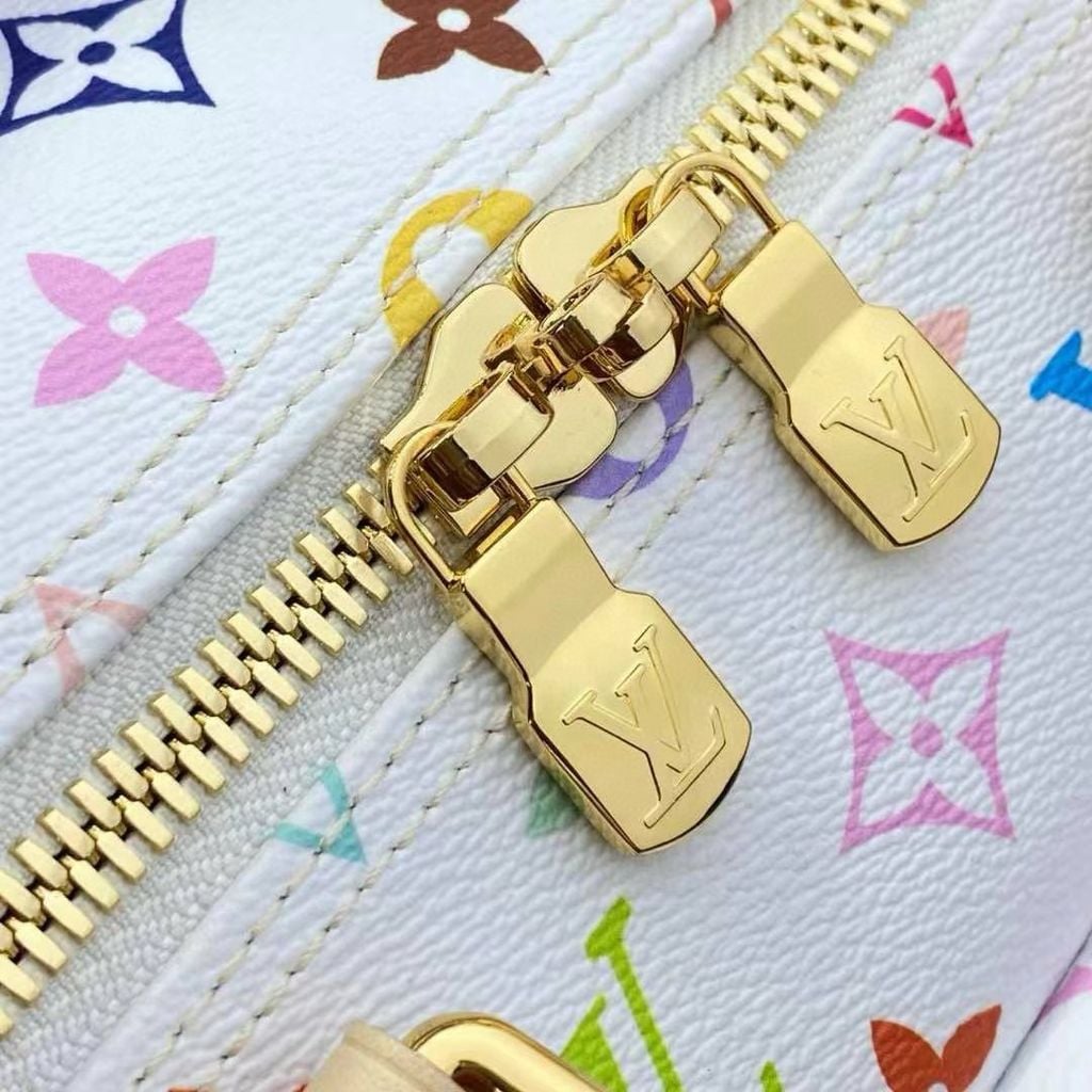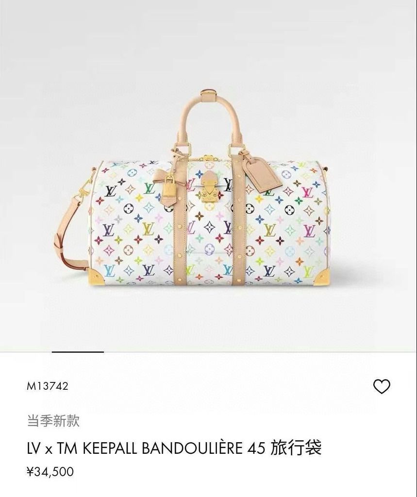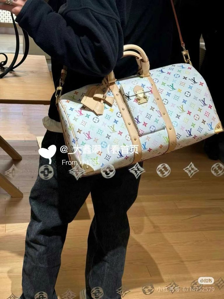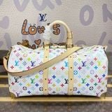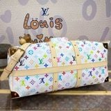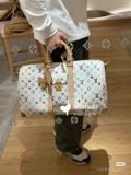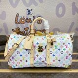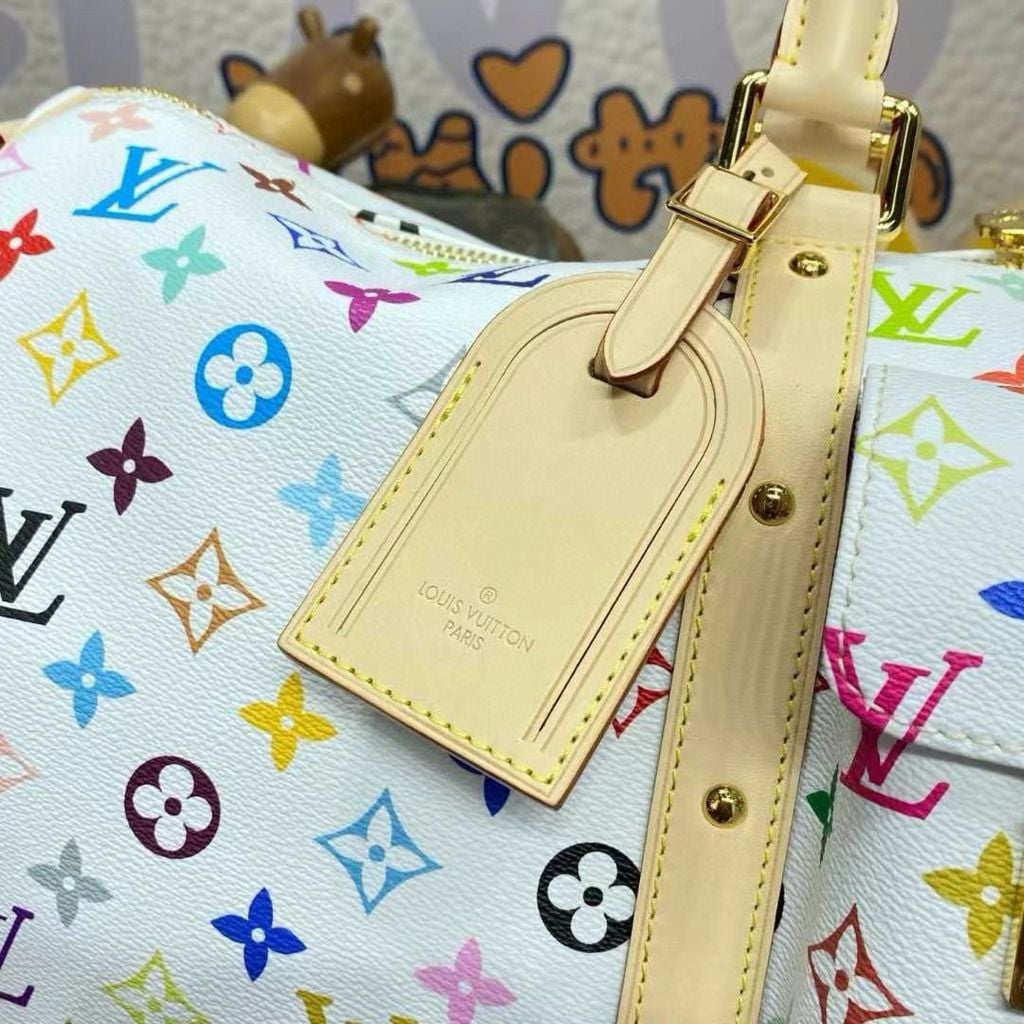 Túi du lịch L*V 45cm màu trắng Chiếc túi du lịch Keepall Bandoulière 45 này thuộc dòng phát hành lại của Takashi Murakami. Nó sử dụng vải canvas phủ Monogram tuyệt đẹp để thể hiện sự pha trộn sáng tạo giữa các yếu tố mang tính biểu tượng của thương hiệu và tính thẩm mỹ óng ánh của nghệ sĩ. Khóa chữ S và các góc kim loại bóng ở túi trước tạo nên nét di sản cổ điển, trong khi dải ruy băng đinh tán và túi đựng chìa khóa hình nơ chỉ ra xu hướng của mùa giải mới. Kích thước: 45*20*27cm