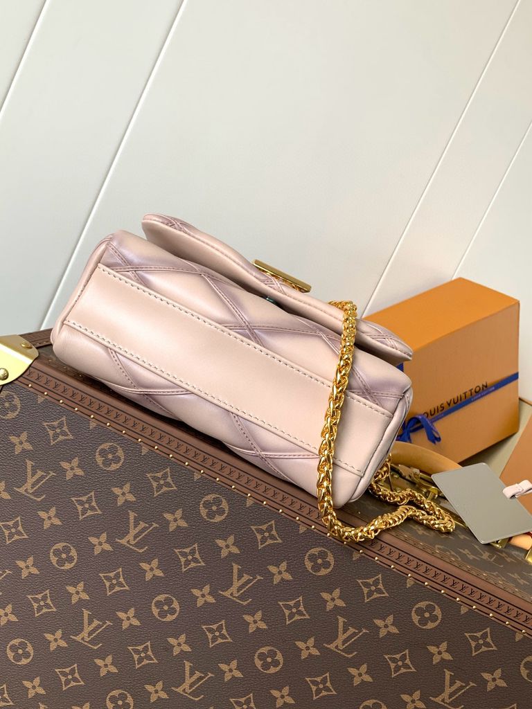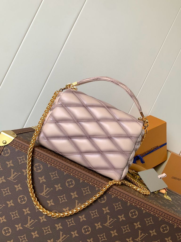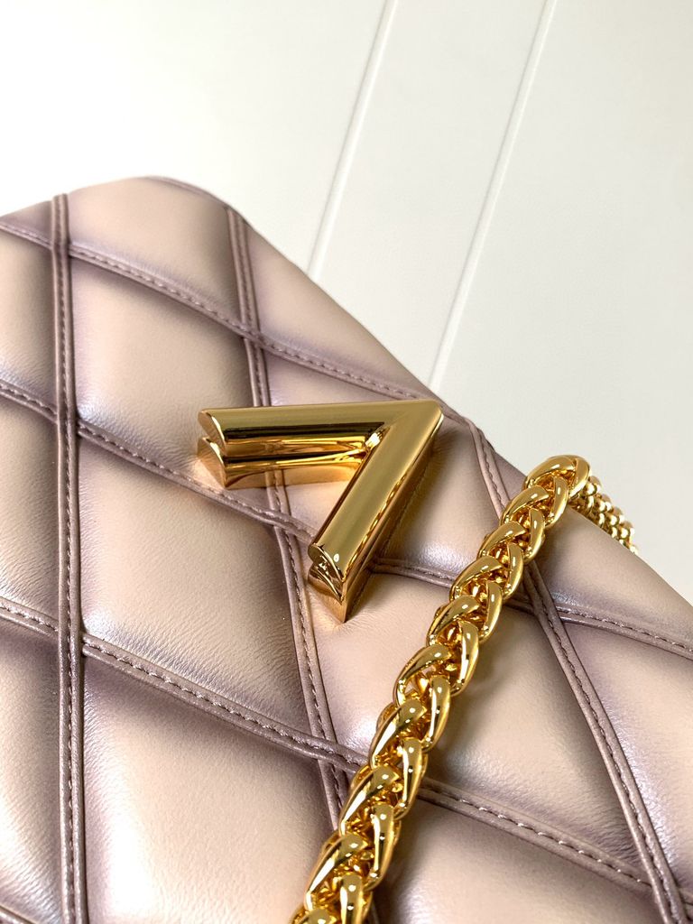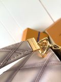 Chiếc túi xách cỡ trung GO-14 này được làm từ da cừu dày dặn, với họa tiết chần bông thể hiện sự tôn kính đối với thiết kế hành lý truyền thống của thương hiệu. Khóa xoắn Twist tăng thêm kiểu dáng bắt mắt, tay cầm phía trên có thể xách bằng tay hoặc có thể biến thành đệm vai bằng da trên dây đeo vai dạng chuỗi trượt để đeo vai hoặc đeo chéo thoải mái.