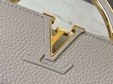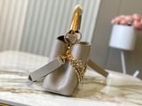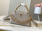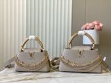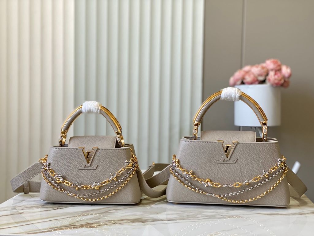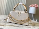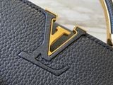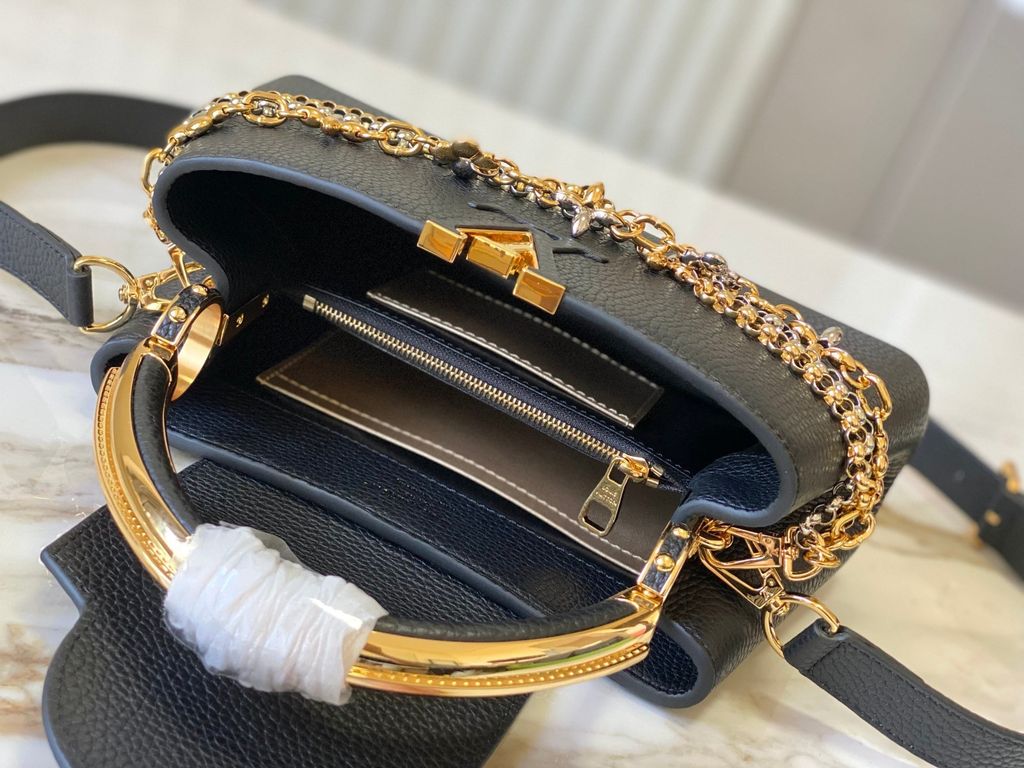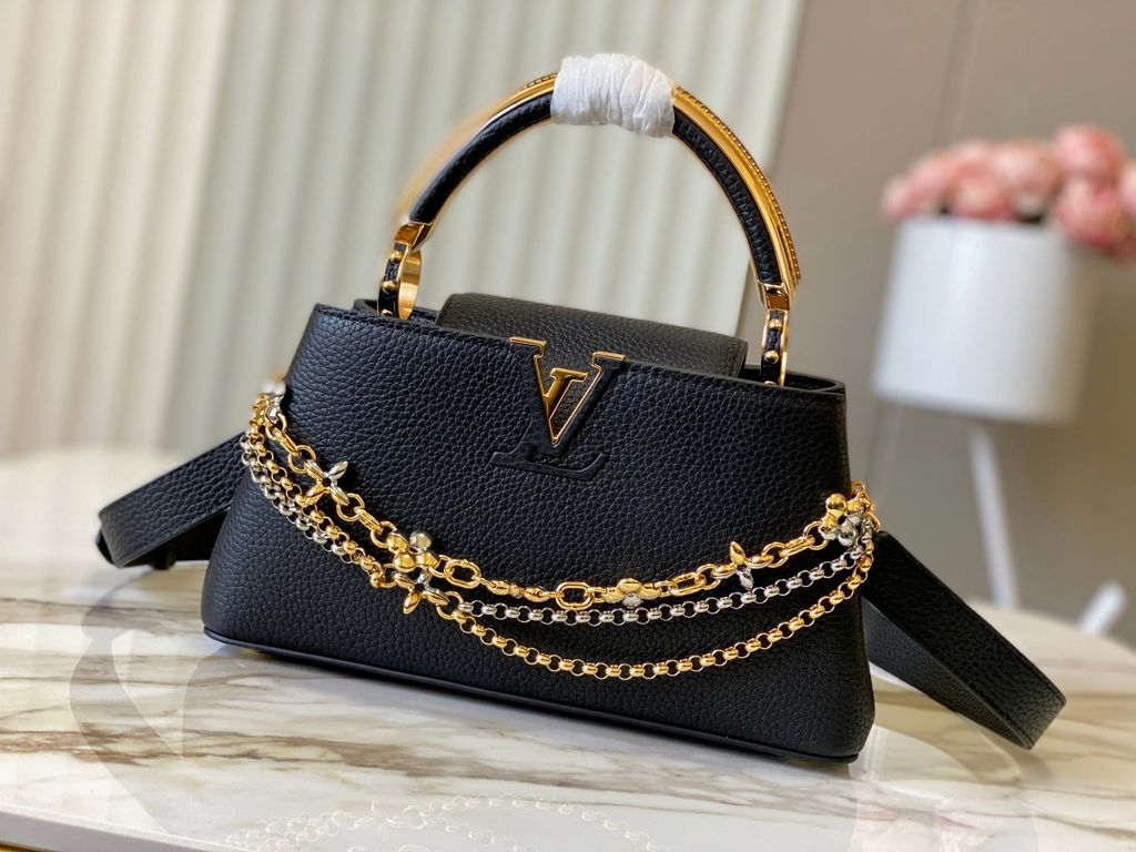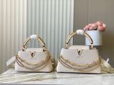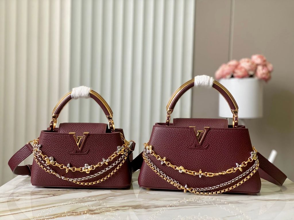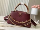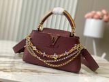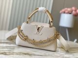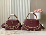 TÚI XÁCH NỮ L V CAPUCINES EAST-WEST TAURILLON – DÂY XÍCH ĐÔI INFINITY, BIỂU TƯỢNG CHỮ CÁI KIM LOẠI SANG TRỌNG (HÀNG ORDER QUỐC TẾ)