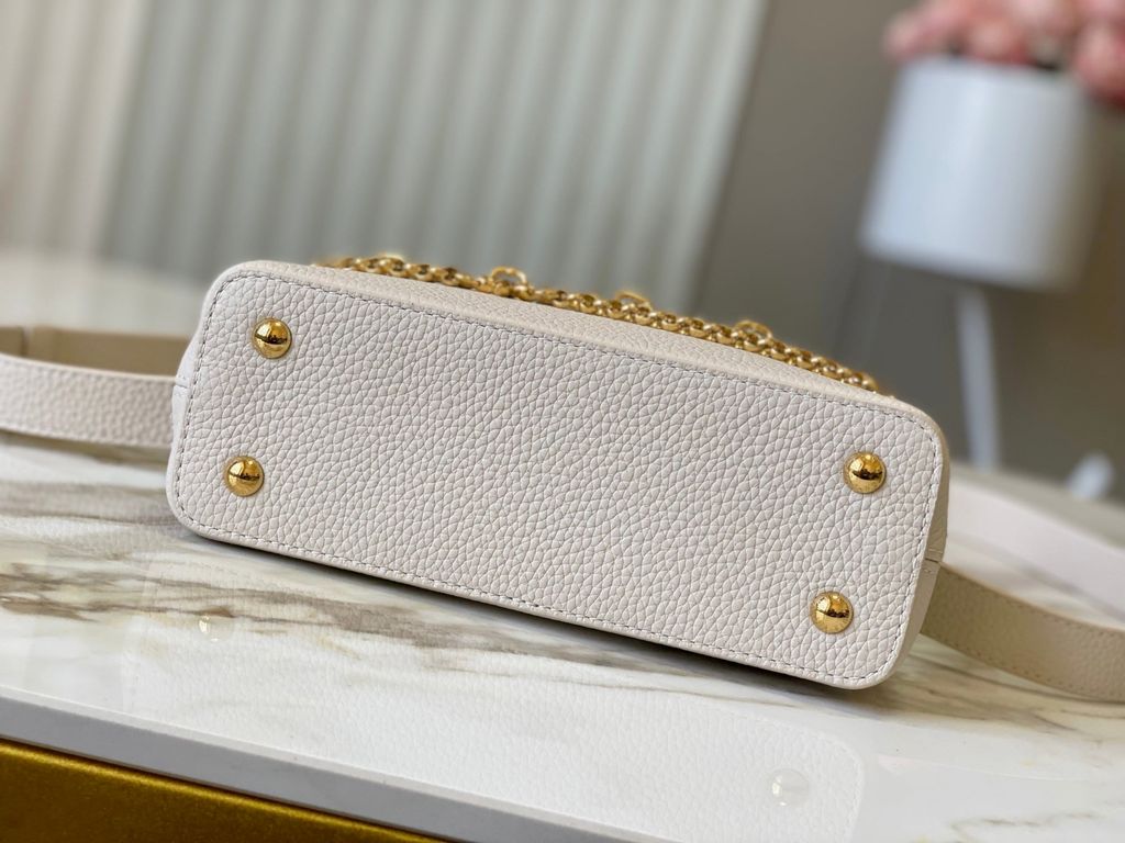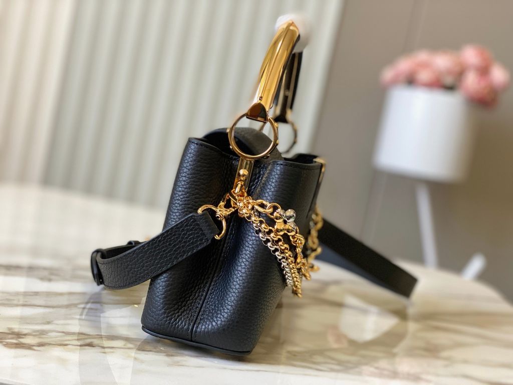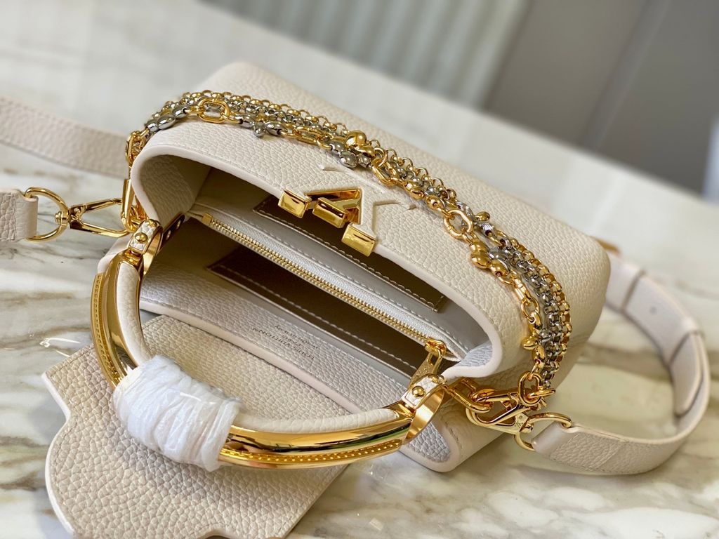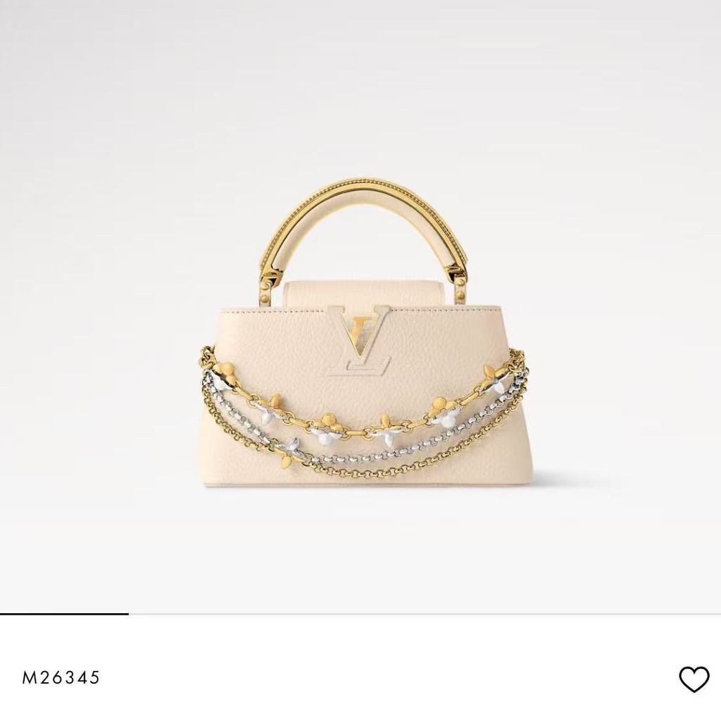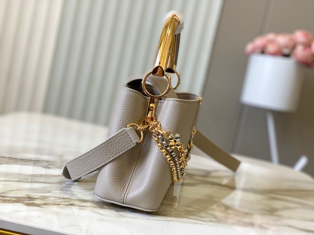Một thiết kế Capucines dáng East-West thanh thoát, tạo cảm giác “gọn mà đắt”, càng nhìn càng thấy độ tinh tế trong tỷ lệ và đường nét. Điểm nhấn kim loại được xử lý sắc sảo, mang đúng tinh thần trang sức cao cấp trên một phom túi biểu tượng.
