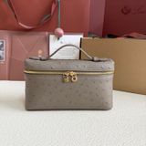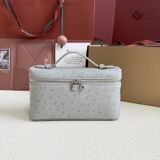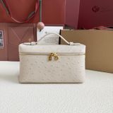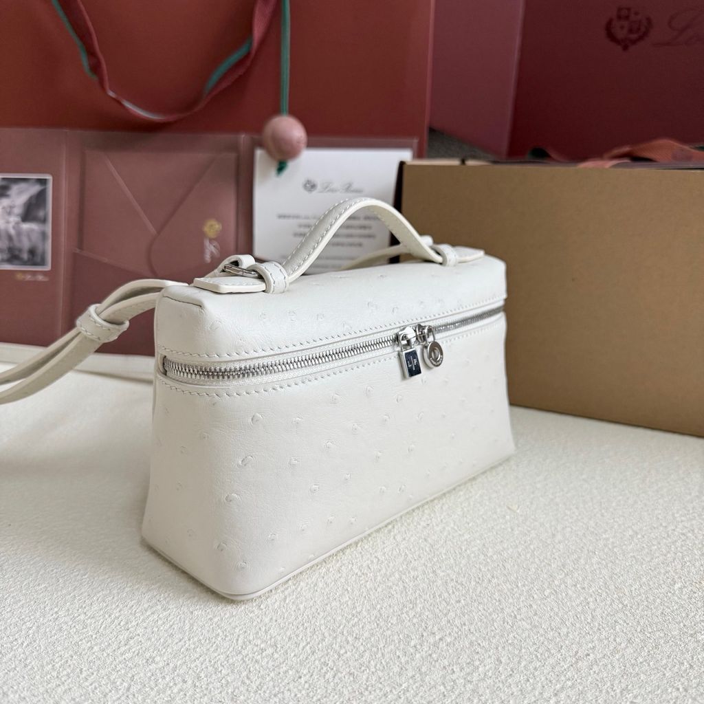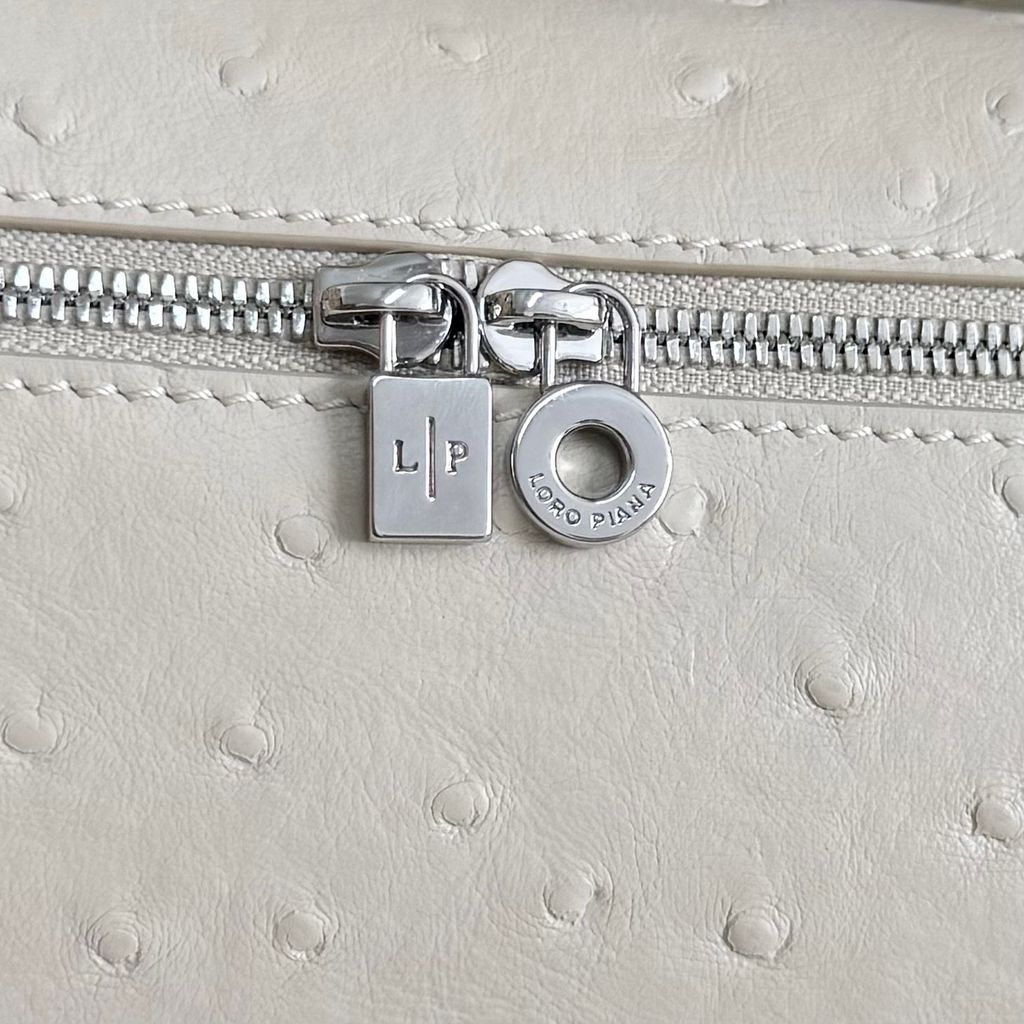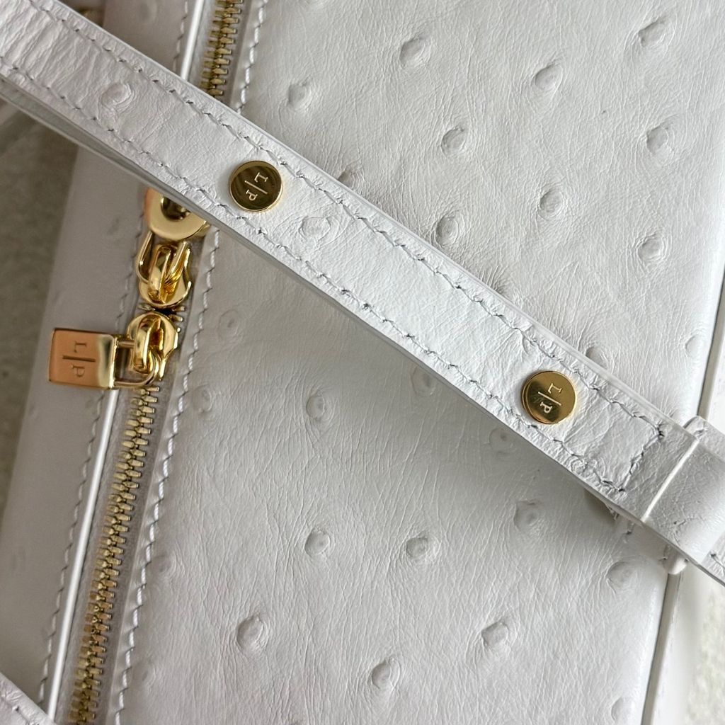 • Bề mặt da dập vân đà điểu tông trắng sữa sang trọng, hiệu ứng ánh nhẹ khi gặp sáng, nhìn gần rất tinh xảo.