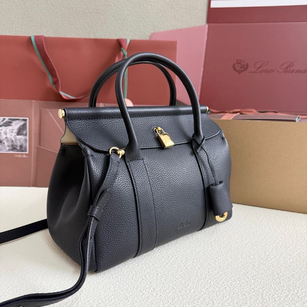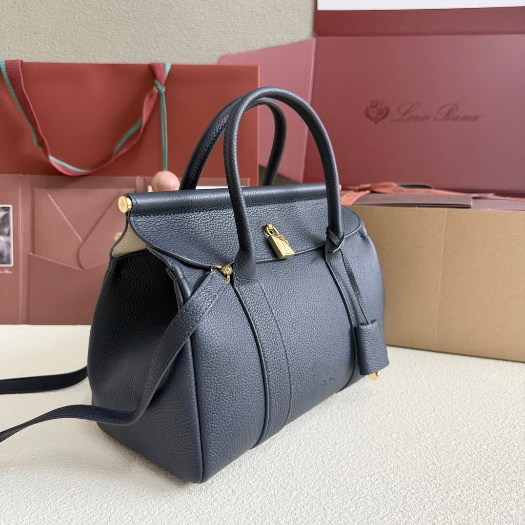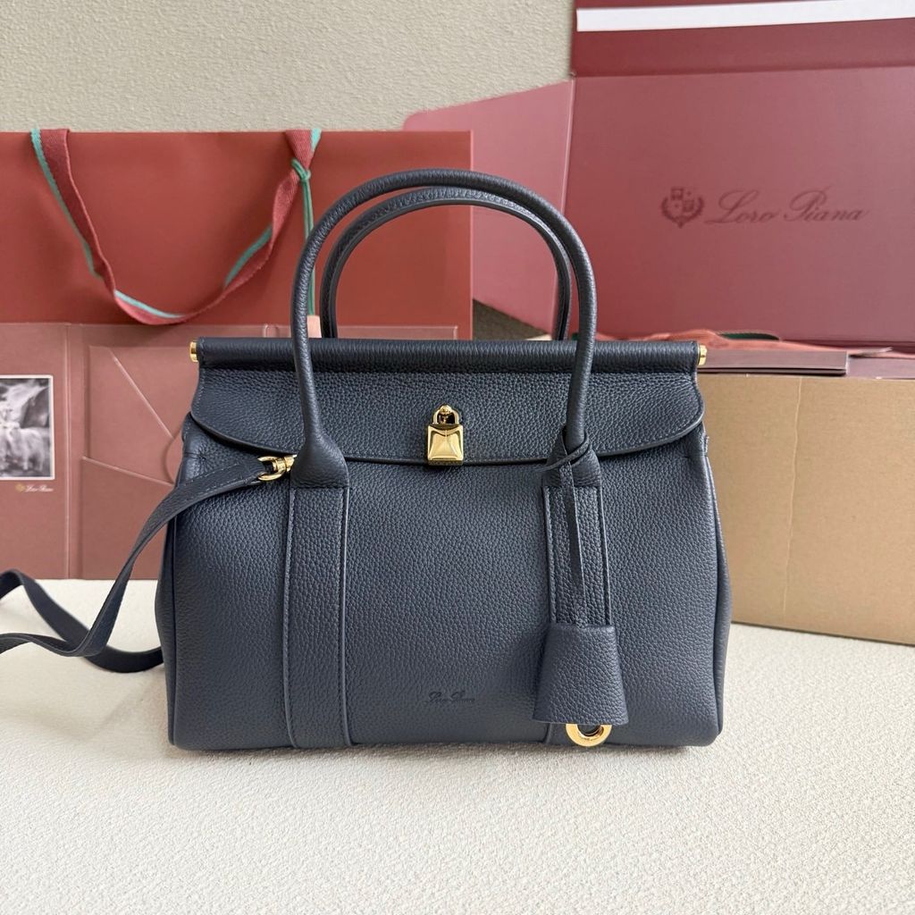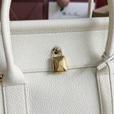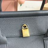 • Khóa kim loại ánh vàng nổi bật trung tâm; tay cầm dày dặn, kèm dây đeo vai tháo rời linh hoạt.