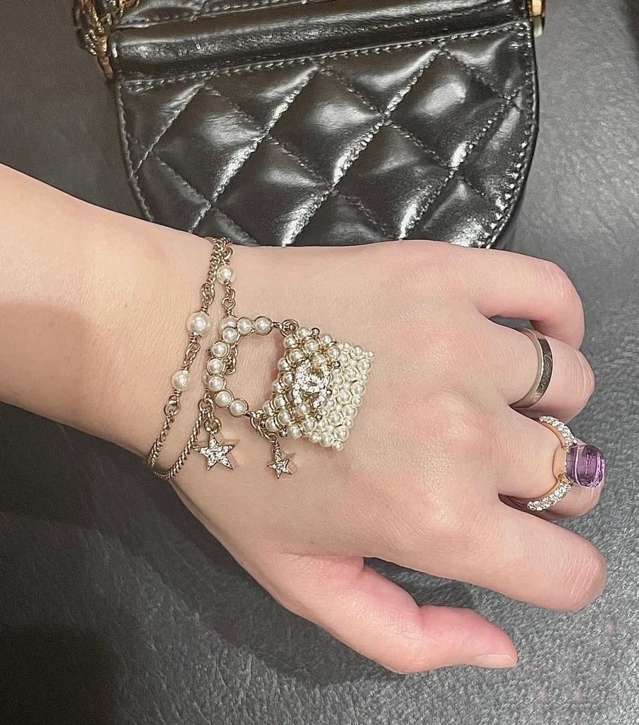 Một điểm nhấn nhỏ nhưng tạo hiệu ứng “đắt giá” rõ rệt: sợi vòng 2 lớp rủ nhẹ trên cổ tay, charm túi ngọc trai mini nổi bật theo kiểu thanh lịch mà vẫn gây thương nhớ ngay từ ánh nhìn đầu tiên.