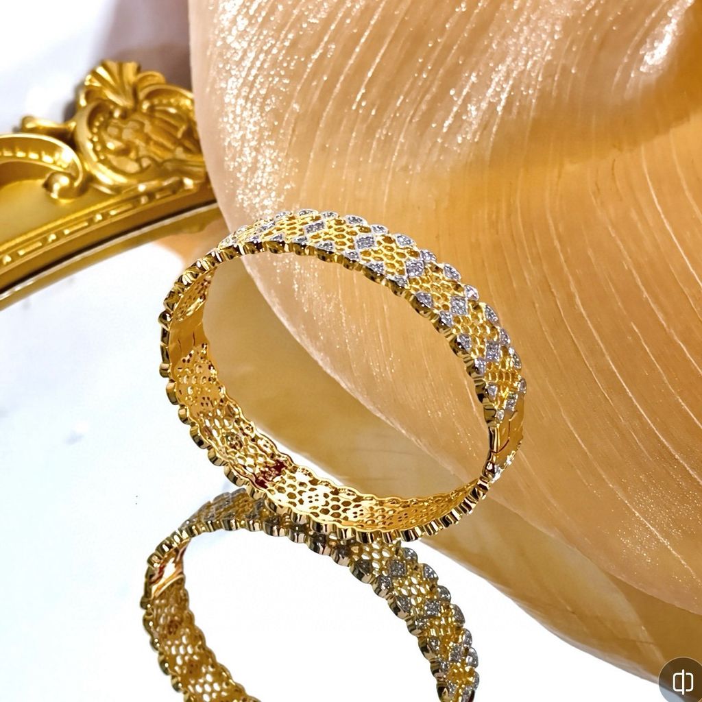 • Họa tiết lưới tổ ong phối viền răng cưa tạo hiệu ứng bề mặt cực bắt sáng, nhìn như một “dải ánh vàng” ôm cổ tay.
