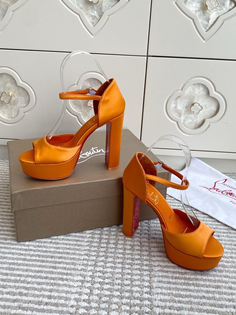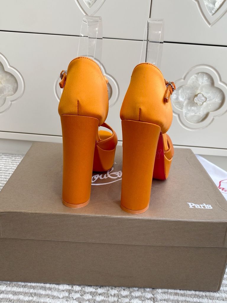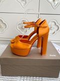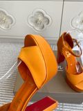 Sắc cam satin rực rỡ kết hợp đế đỏ nổi bật, đôi sandal cao gót platform này sinh ra để thu hút mọi ánh nhìn trong từng bước chân.