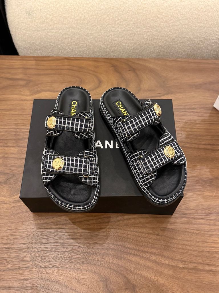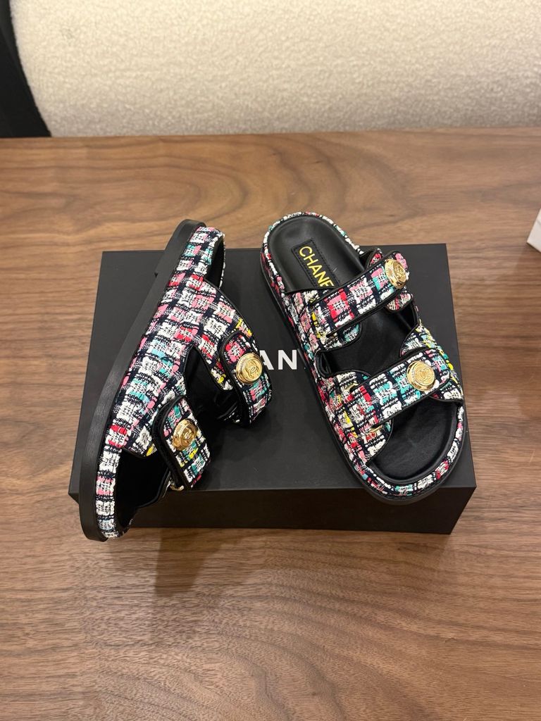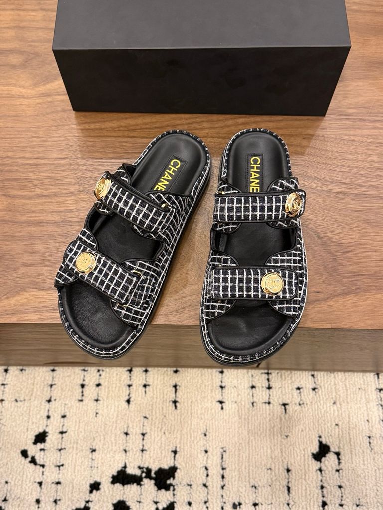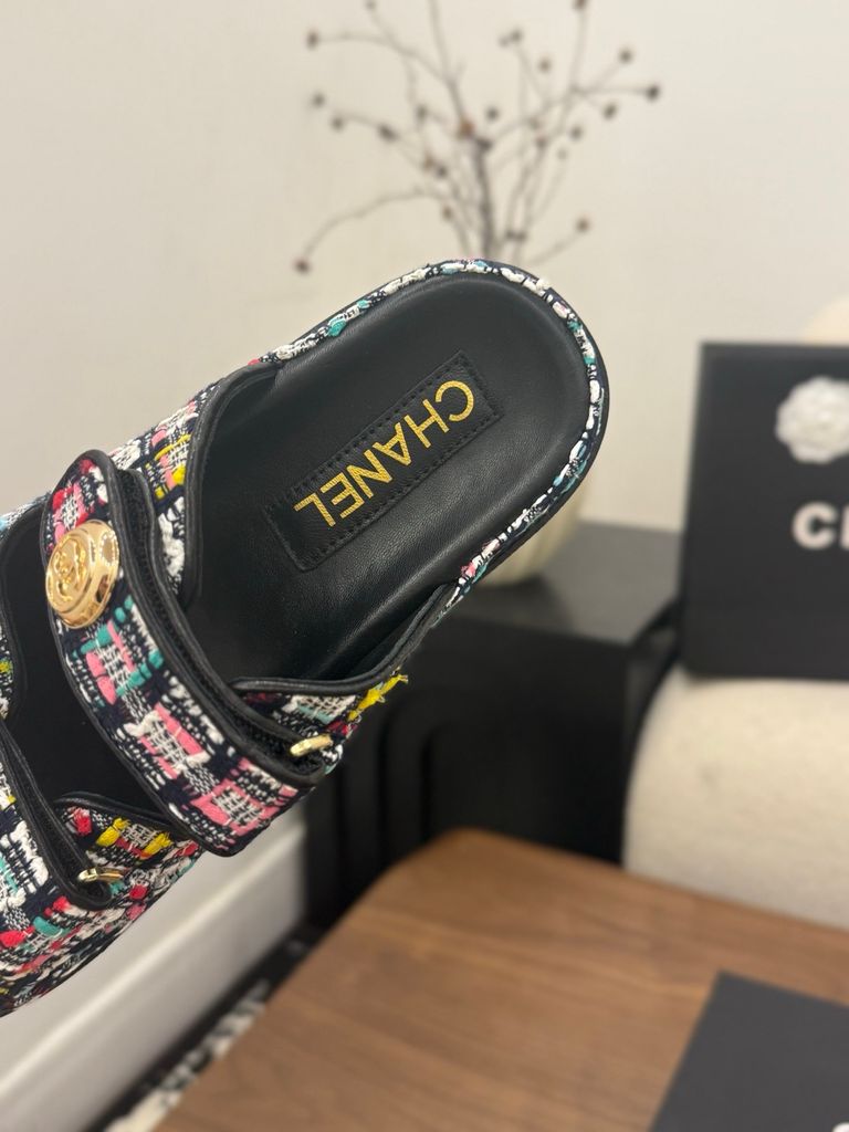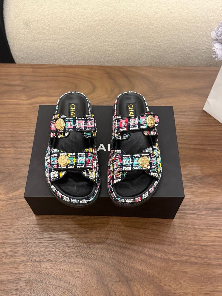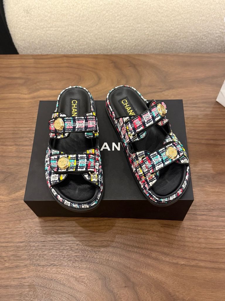 SANDAL NỮ CN DÁNG SLIDE TWEED SIGNATURE – NÚT LOGO ÁNH KIM SANG TINH TẾ 1600k (HÀNG CÓ SẴN)
