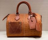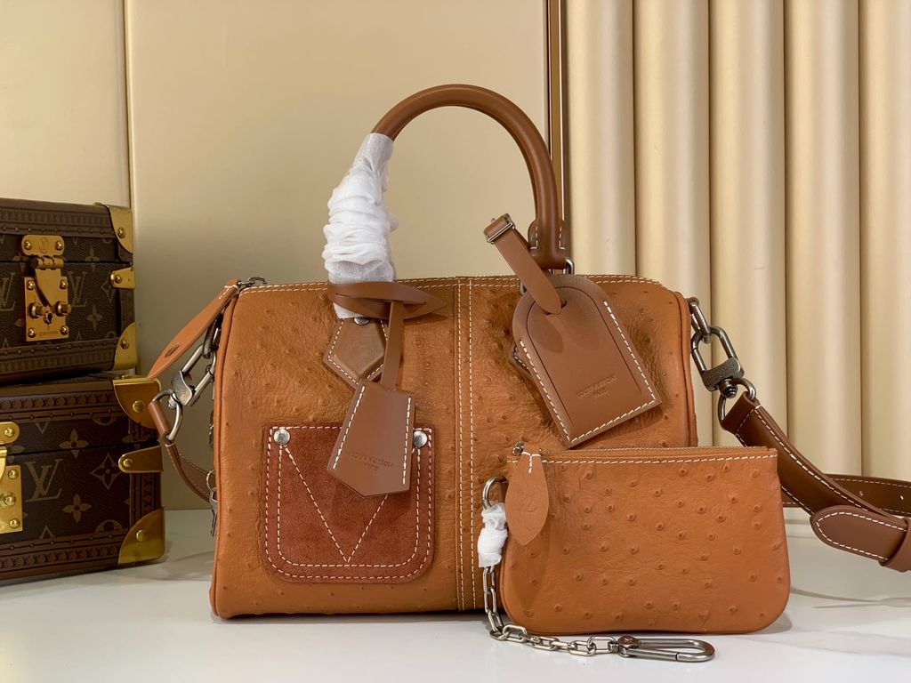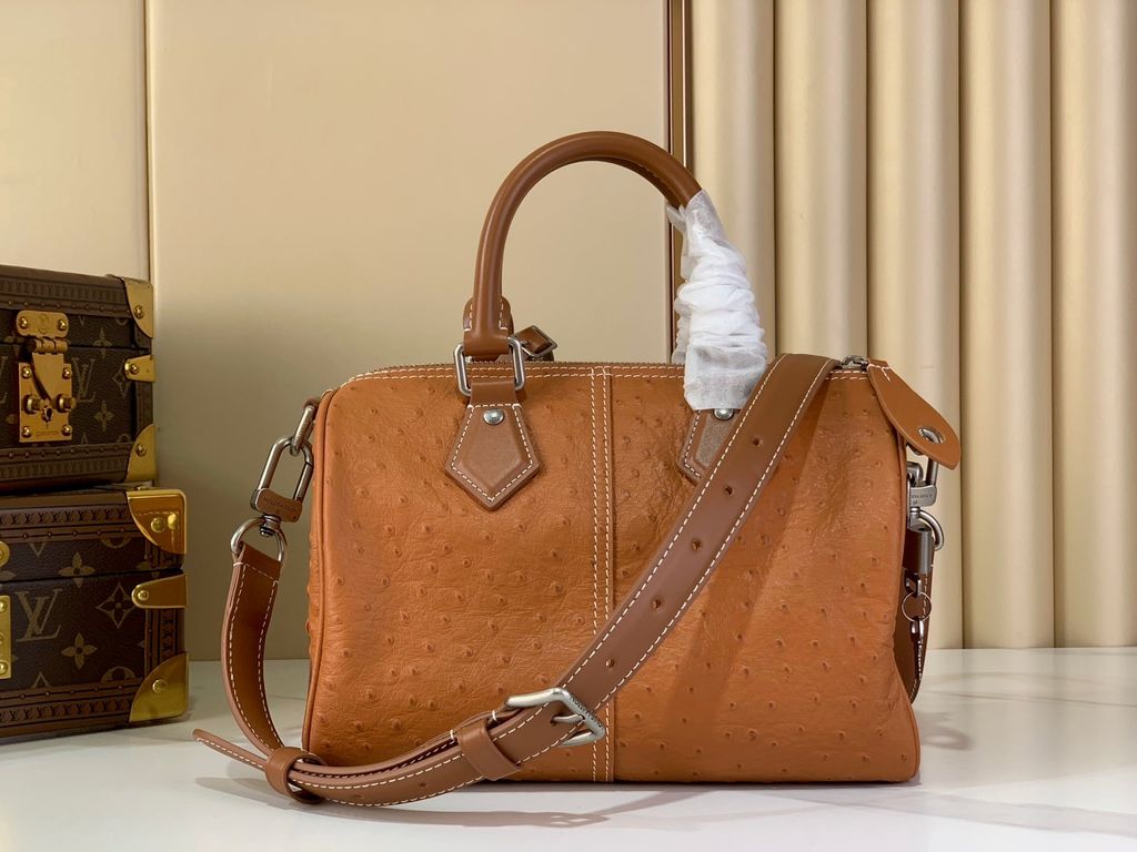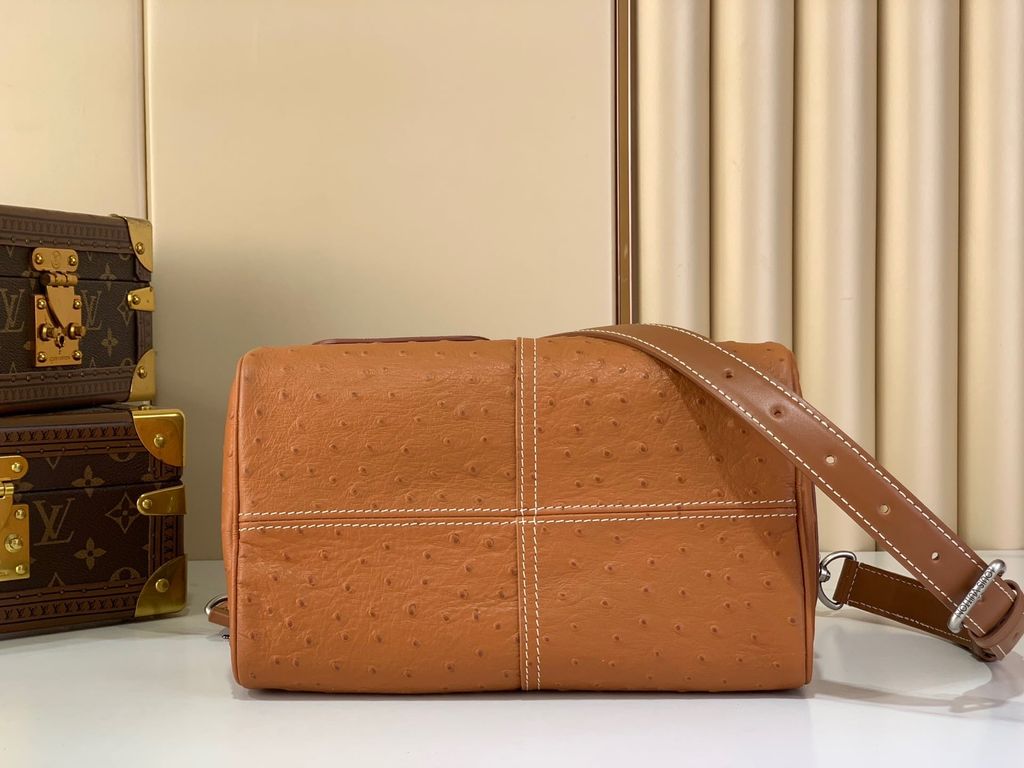 Một phiên bản Speedy 25 ghi dấu ấn rất mạnh ở bề mặt vân đà điểu nổi kết hợp Monogram chìm trên nền da, nhìn là thấy khác biệt.