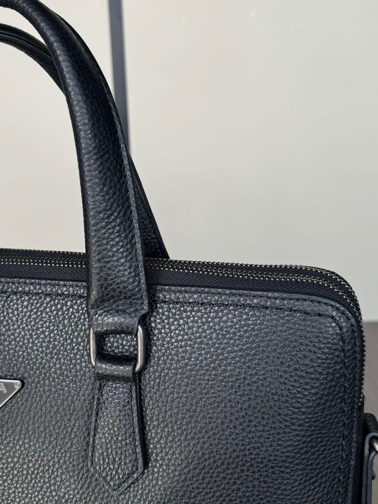• Bề mặt da sần đen sang trọng, điểm logo tam giác kim loại tinh tế ở mặt trước, nhận diện thương hiệu rõ mà vẫn giữ phong thái kín đáo.