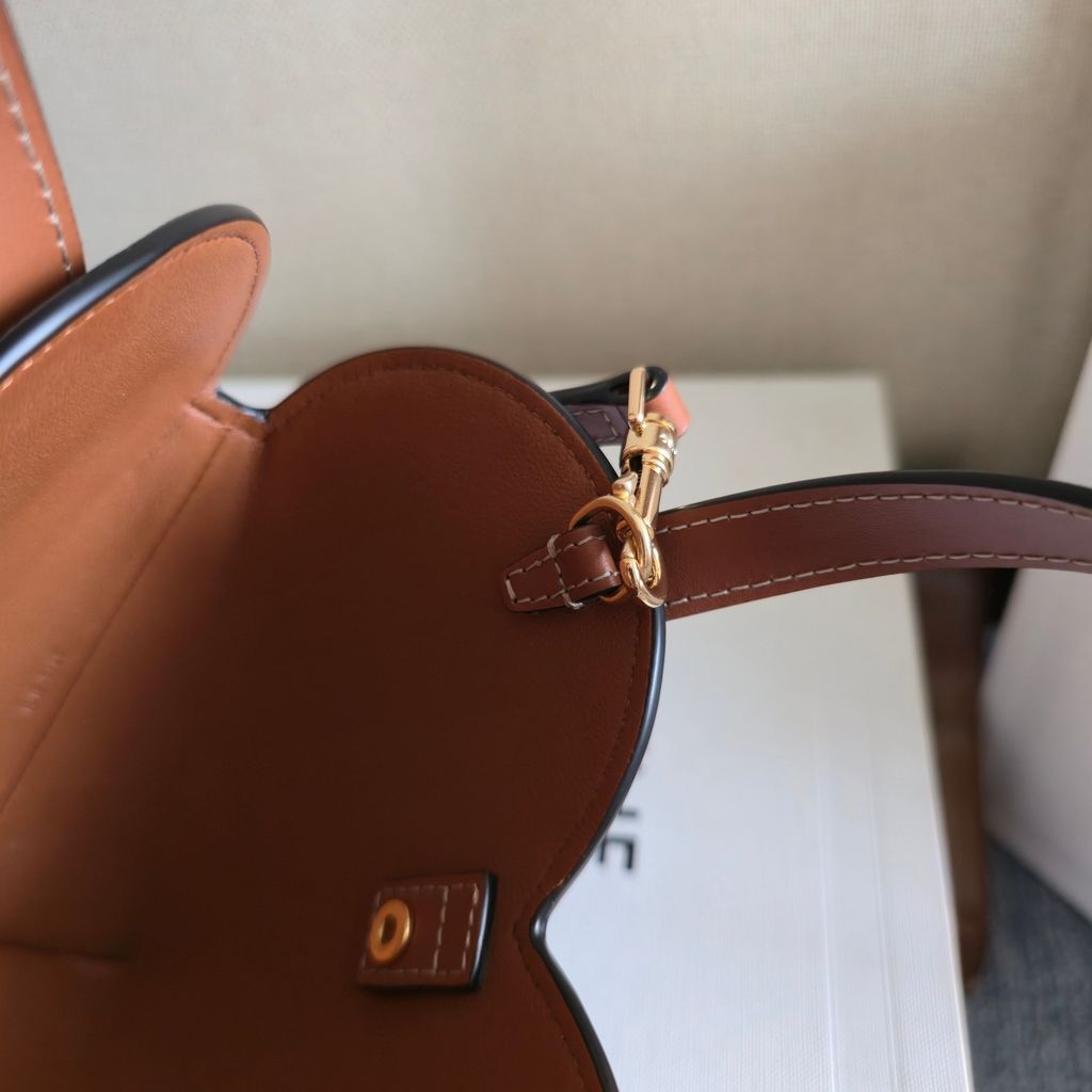 • Viền và quai da nâu caramel, chi tiết kim loại ánh vàng làm tổng thể ấm áp, nữ tính và rất dễ phối đồ.