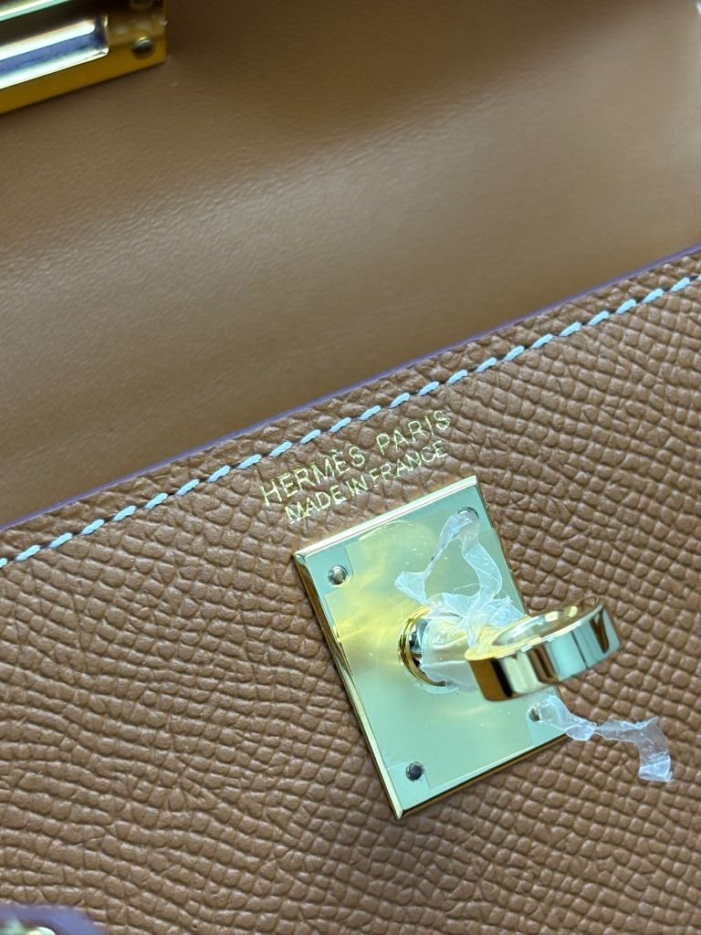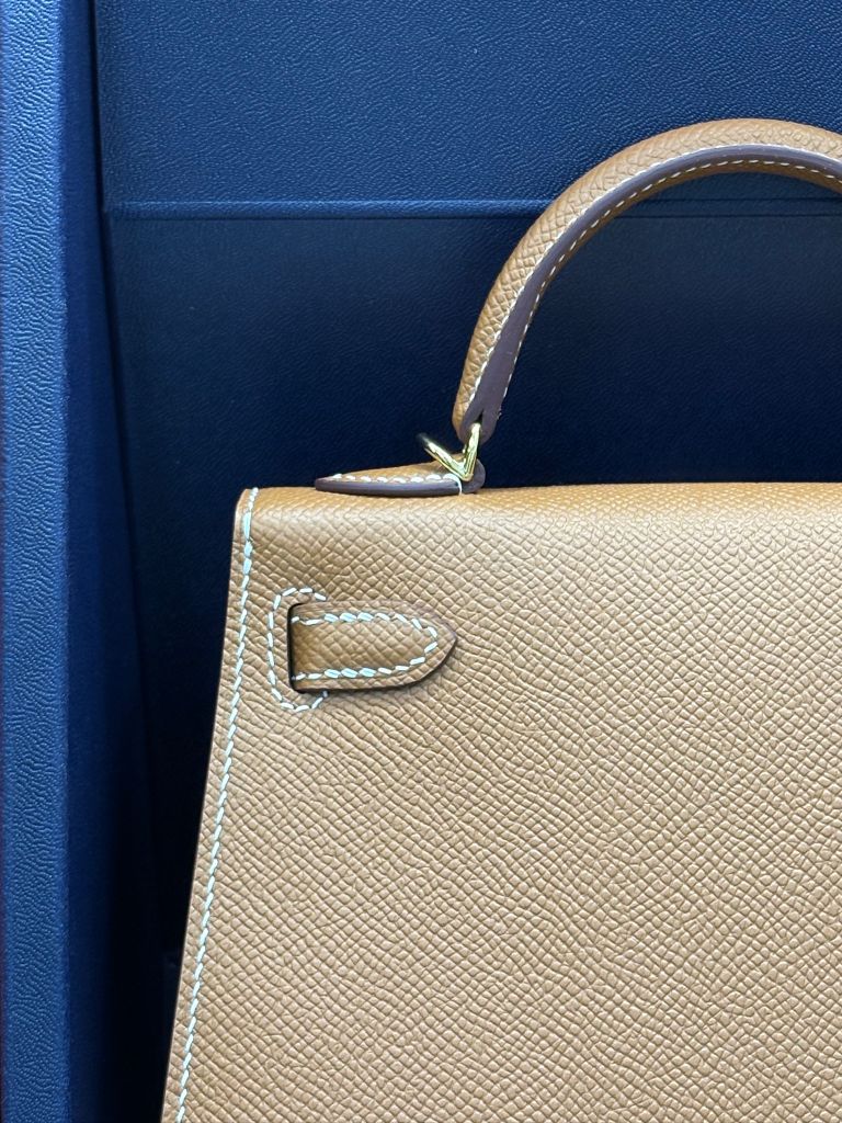 • Nắp gập đặc trưng Kelly với chi tiết khoá xoay vàng và quai xách thanh mảnh, đường chỉ trắng nổi bật tạo điểm nhấn tinh xảo.