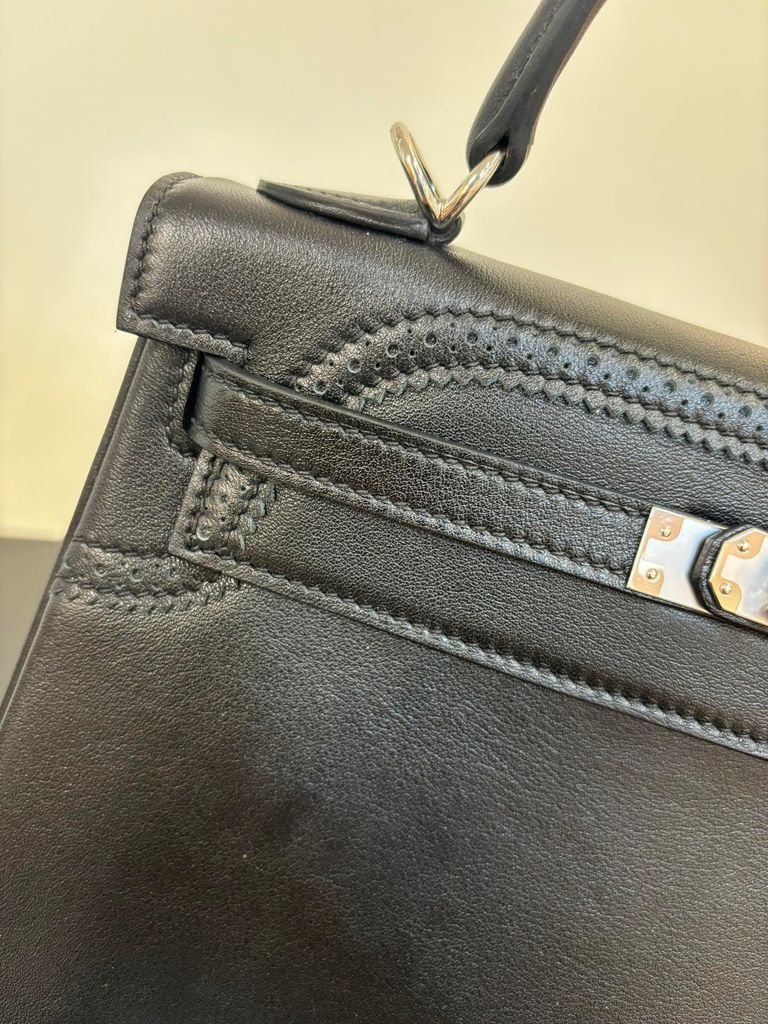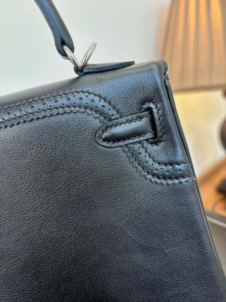 • Nắp gập đặc trưng Kelly với chi tiết khoá xoay vàng và quai xách thanh mảnh, đường chỉ trắng nổi bật tạo điểm nhấn tinh xảo.