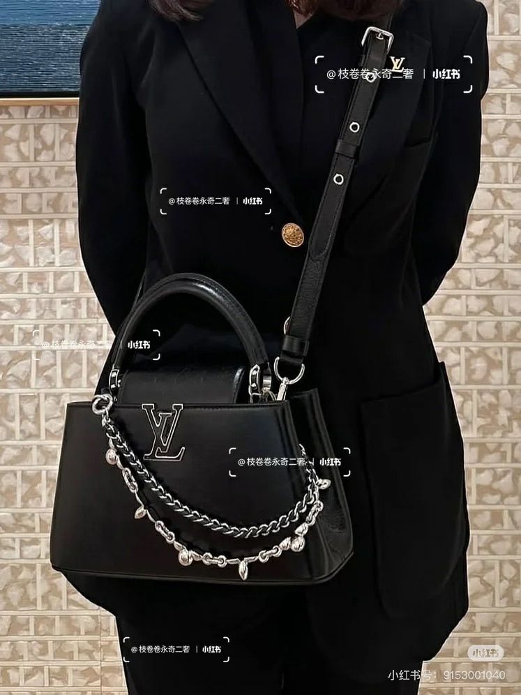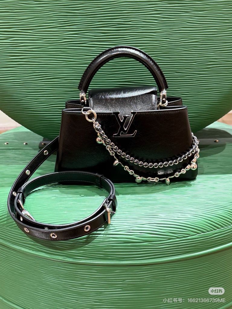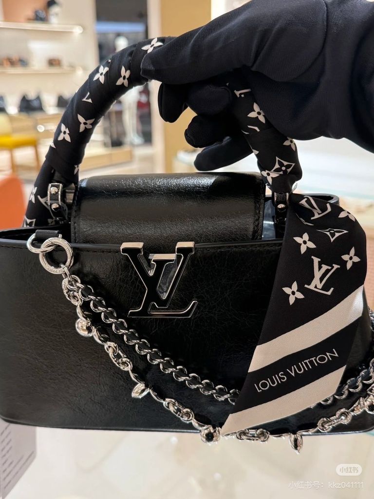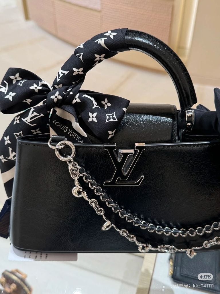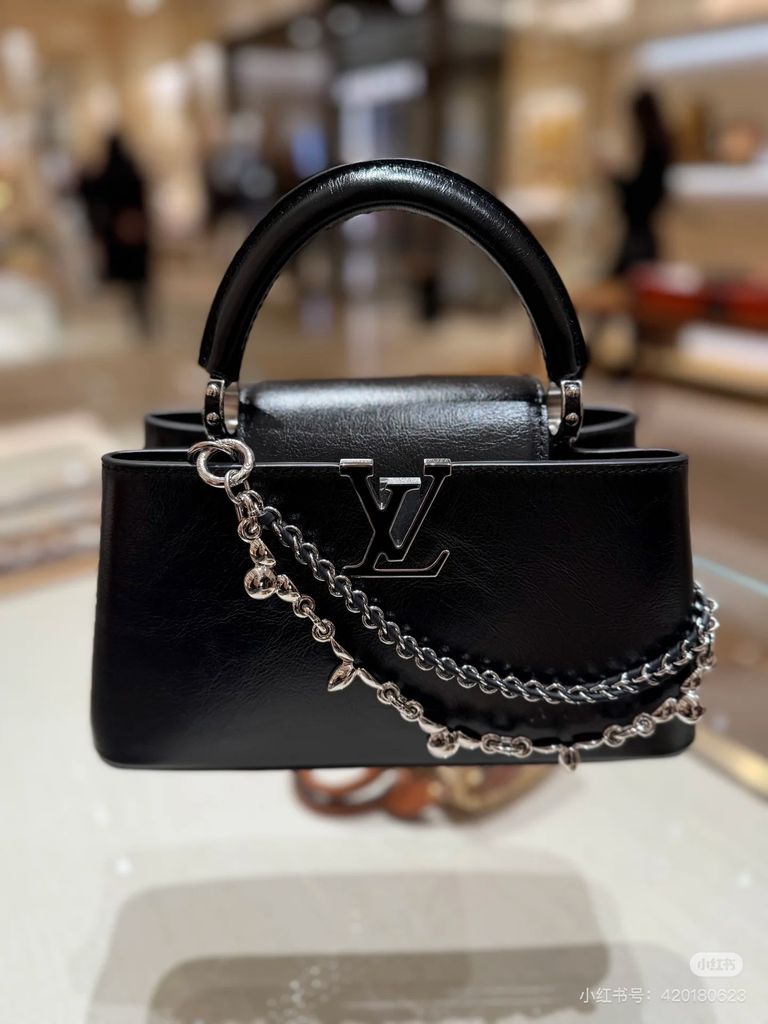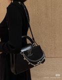 TÚI XÁCH NỮ LV* CAPUCINES EAST-WEST ĐEN OIL WAX – CHUỖI BẠC, PHIÊN BẢN MỚI 22cm 6600k/ 29cm 7200k (HÀNG ORDER QUỐC TẾ)