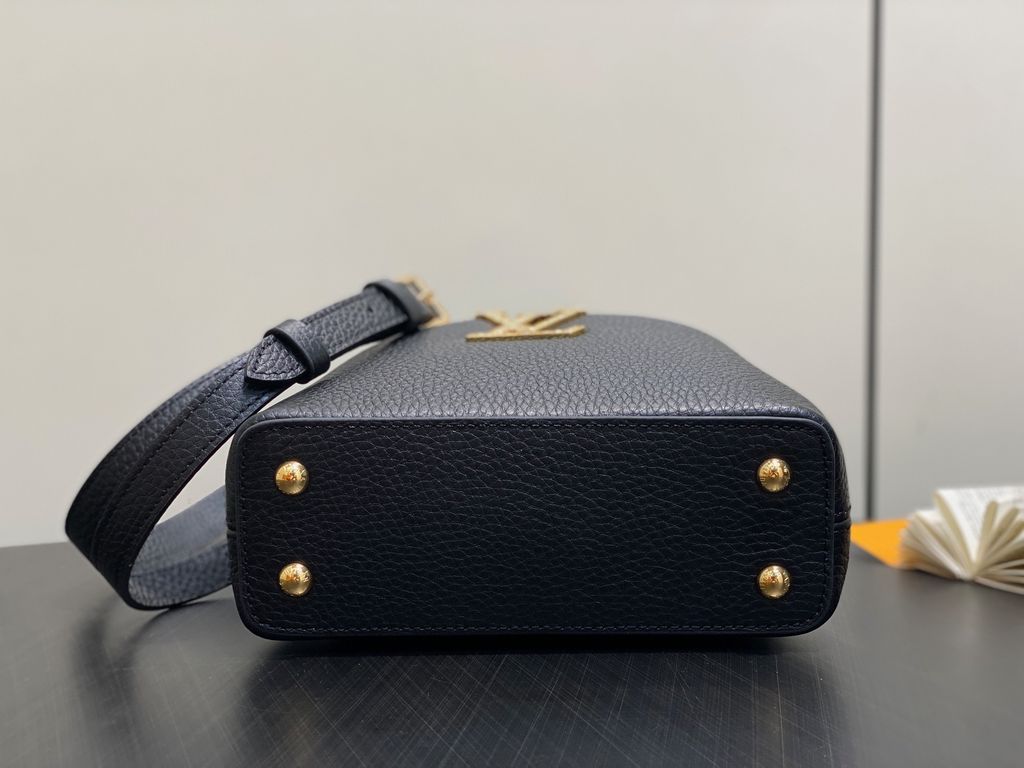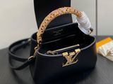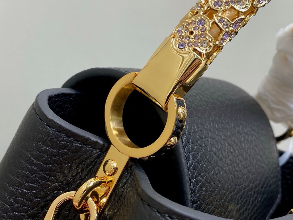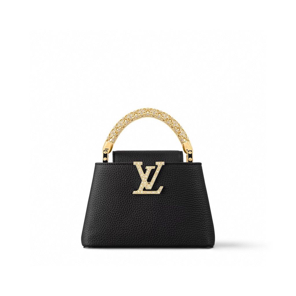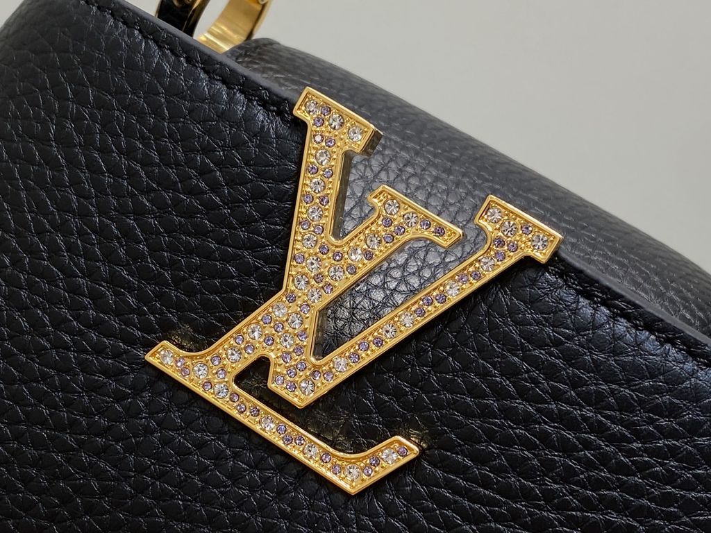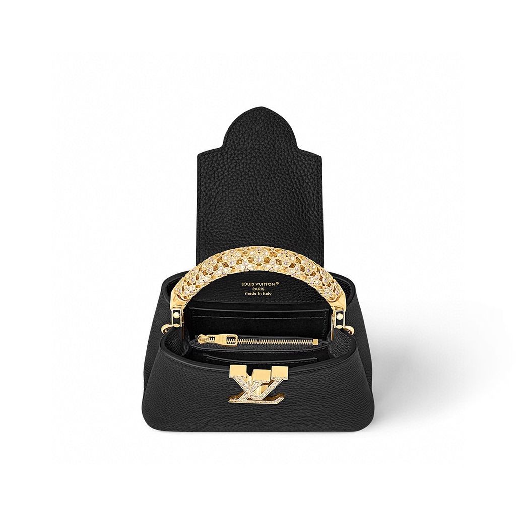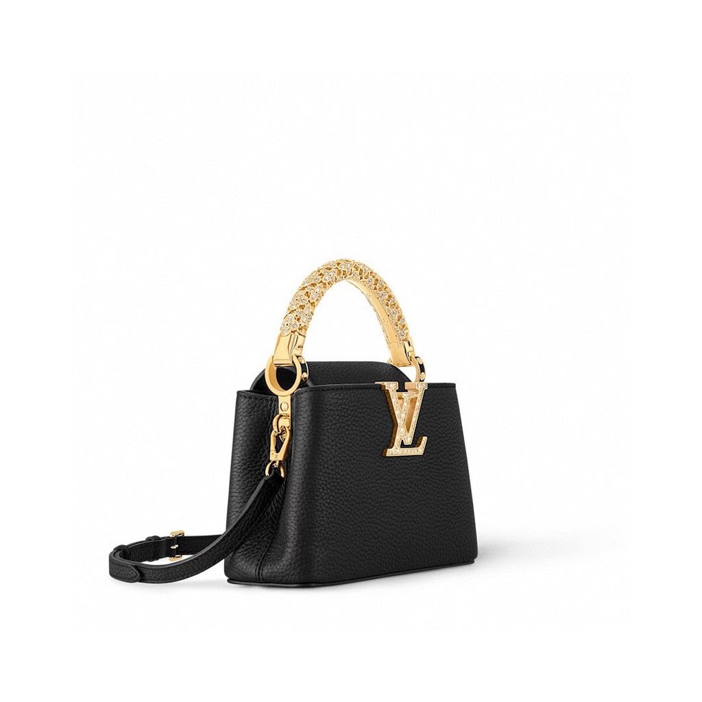 TÚI XÁCH NỮ LV* CAPUCINES MINI “FLOWER CROWN” – DA TAURILLON ĐEN, TAY CẦM ĐÍNH PHA LÊ 6600k (HÀNG ORDER QUỐC TẾ)