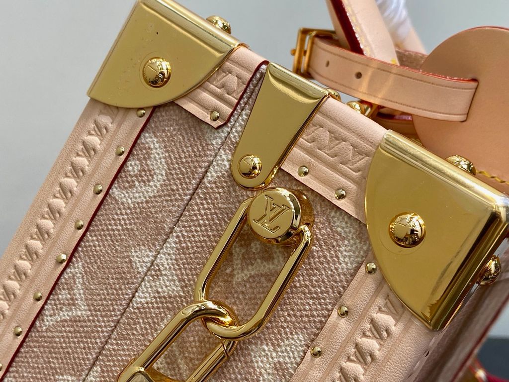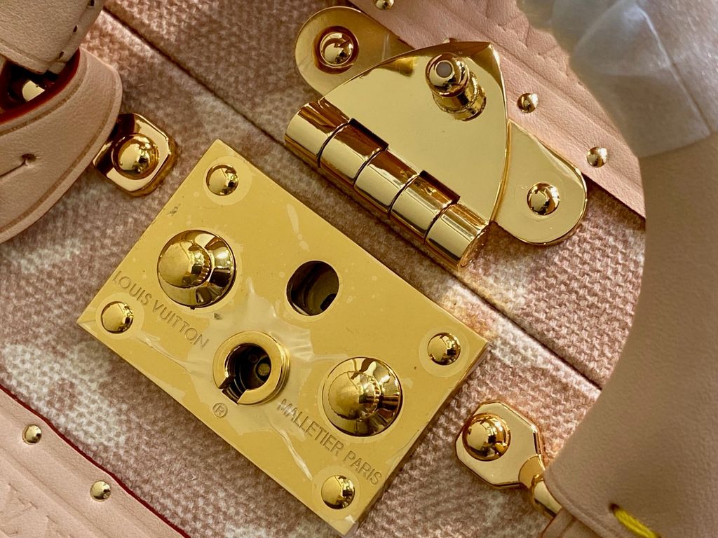 Gợi cảm hứng từ vali di sản thu nhỏ, tông hồng phấn thanh lịch kết hợp chi tiết kim loại ánh vàng mang lại diện mạo sang trọng, nổi bật ngay khi lên tay.