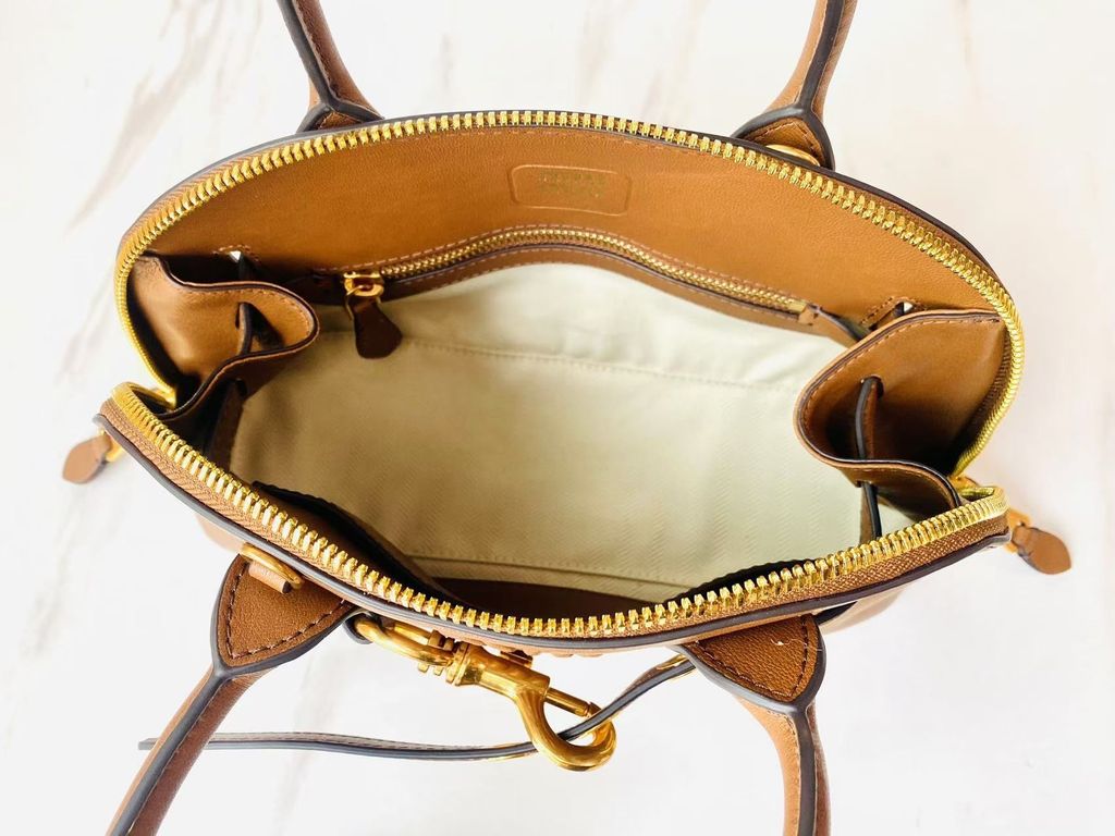 • Chi tiết dây trang trí và khoen kim loại tông vàng nổi bật trên nền da nâu, tạo điểm nhấn thu hút mà vẫn giữ được sự cổ điển.